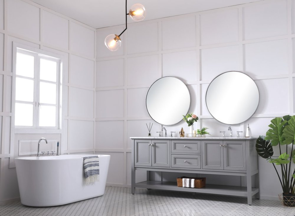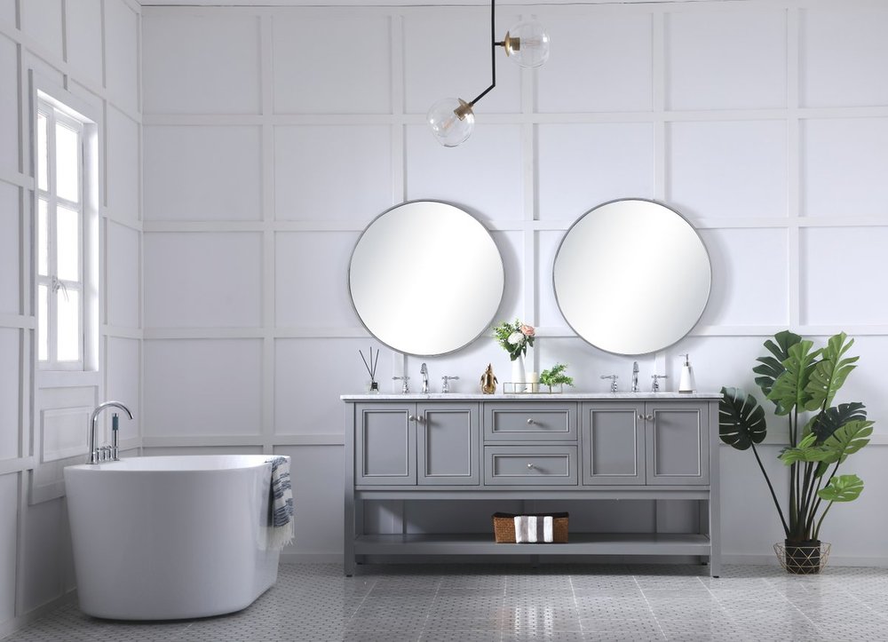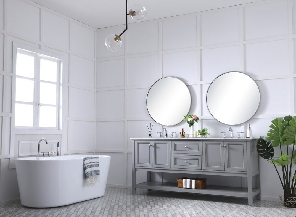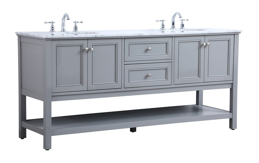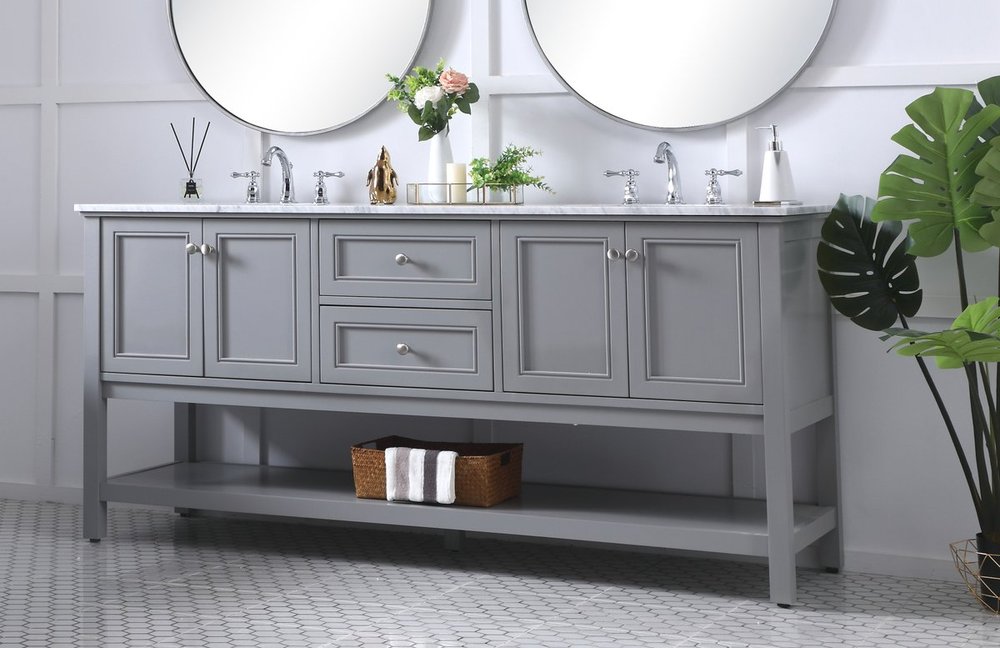 Create a refined and relaxing bath space with this contemporary design vanity, presenting its simplicity and clean straight lines in a minimalist appeal. This 60" freestanding vanity, crafted of solid poplar wood in soft-grey finish, provides ample storage within its double center drawers and 4 side doors, all equipped with soft closing mechanism and accentuated with gleaming chrome hardware. Rounding out the design is a luxurious Itallian Carrara white marble countertop and double white porcelain under-mount oval sink.
