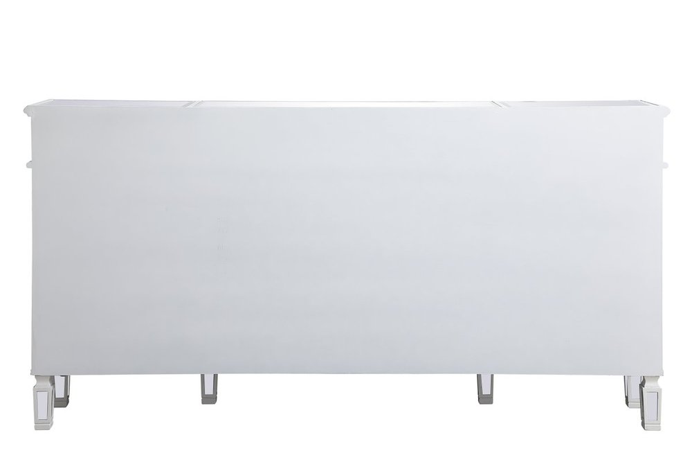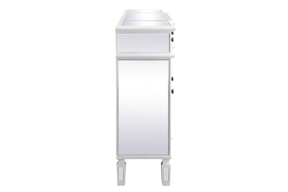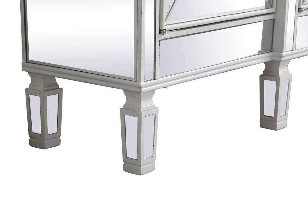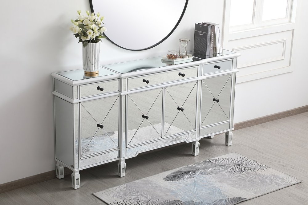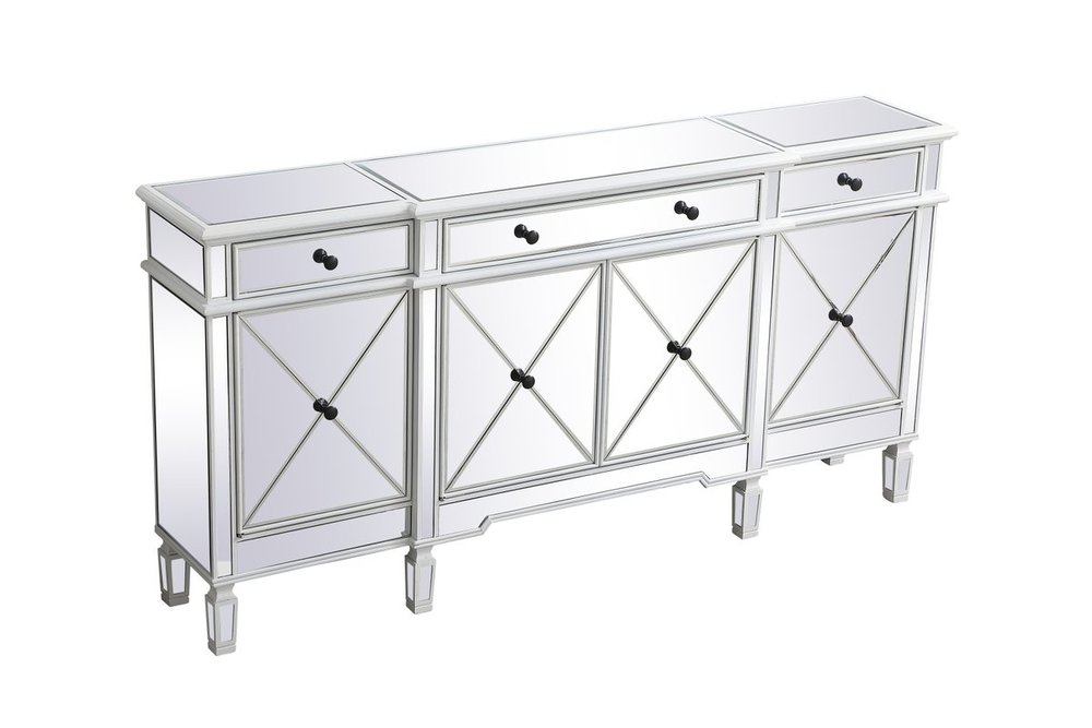 Make a striking statement with this gleaming mirrored credenza and live in the elegantly sleek future. Its contemporary style is defined by the alternating panels of polished beveled mirror panels. Its alternating panels that wrap around the entire cabinet creates an amusing design that everyone will enjoy and marvel at. Place this credenza in your home and adorn it with your favorite objects—captivating art pieces, beautiful floral arrangements, or even personal treasures like family portraits. Ships fully assembled with the exception of installing the legs.