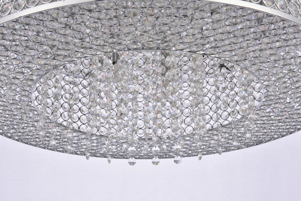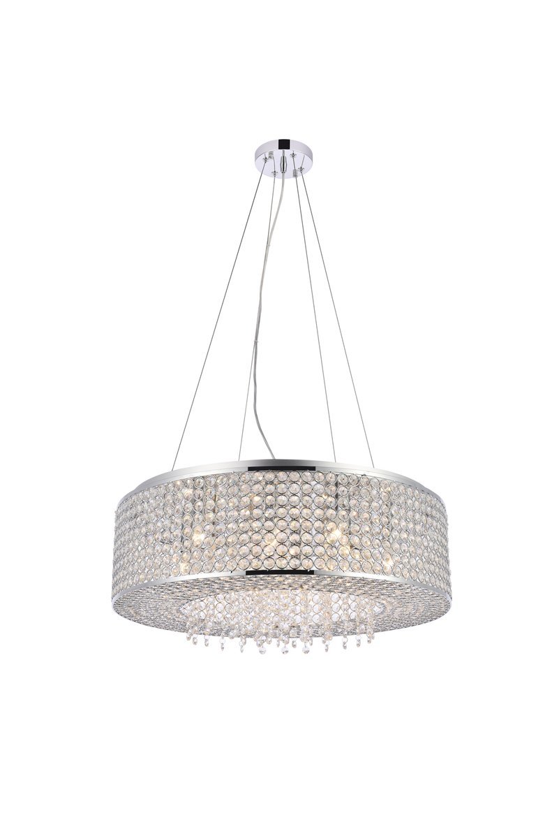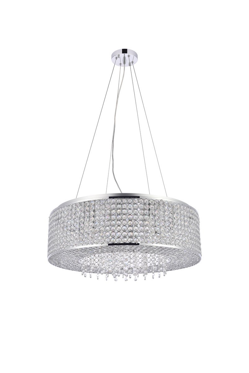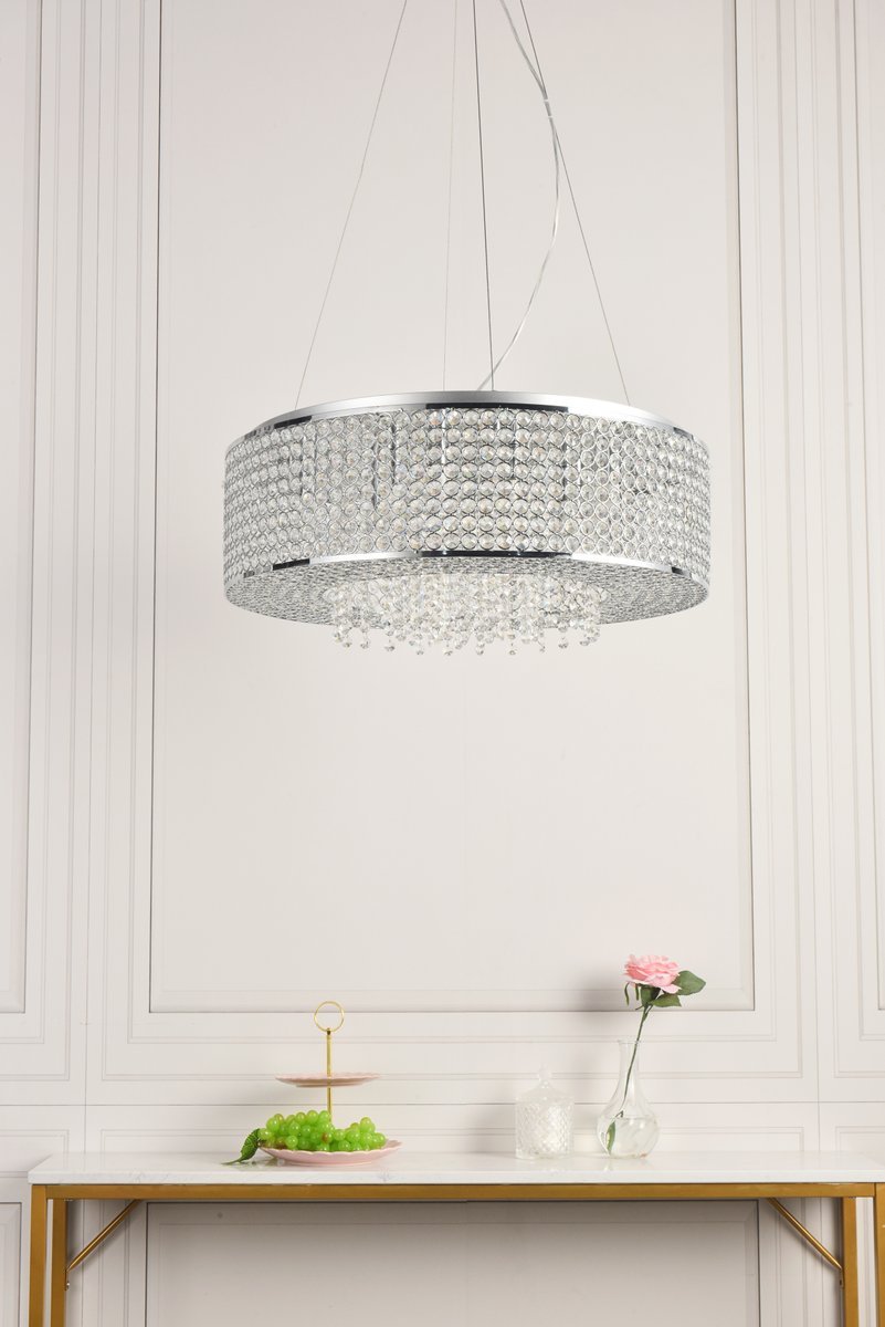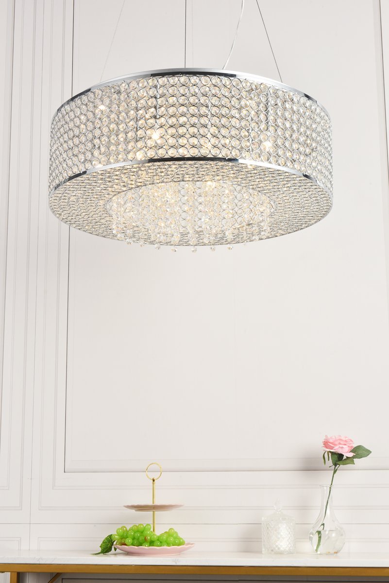Like a brilliant shining star, the Amelie collection of hanging fixtures emits dazzling light from a bejeweled circular band, accented with gleaming strands of royal-cut crystals pouring through the open center. This chrome-finished ring surrounds four to 10 lights (not included) that highlight the intricate pattern of miniature circles that embellish the sides and bottom of the frame. in natural light, or with electricity, this sparkling hanging light would become a stunning showpiece for your space.
