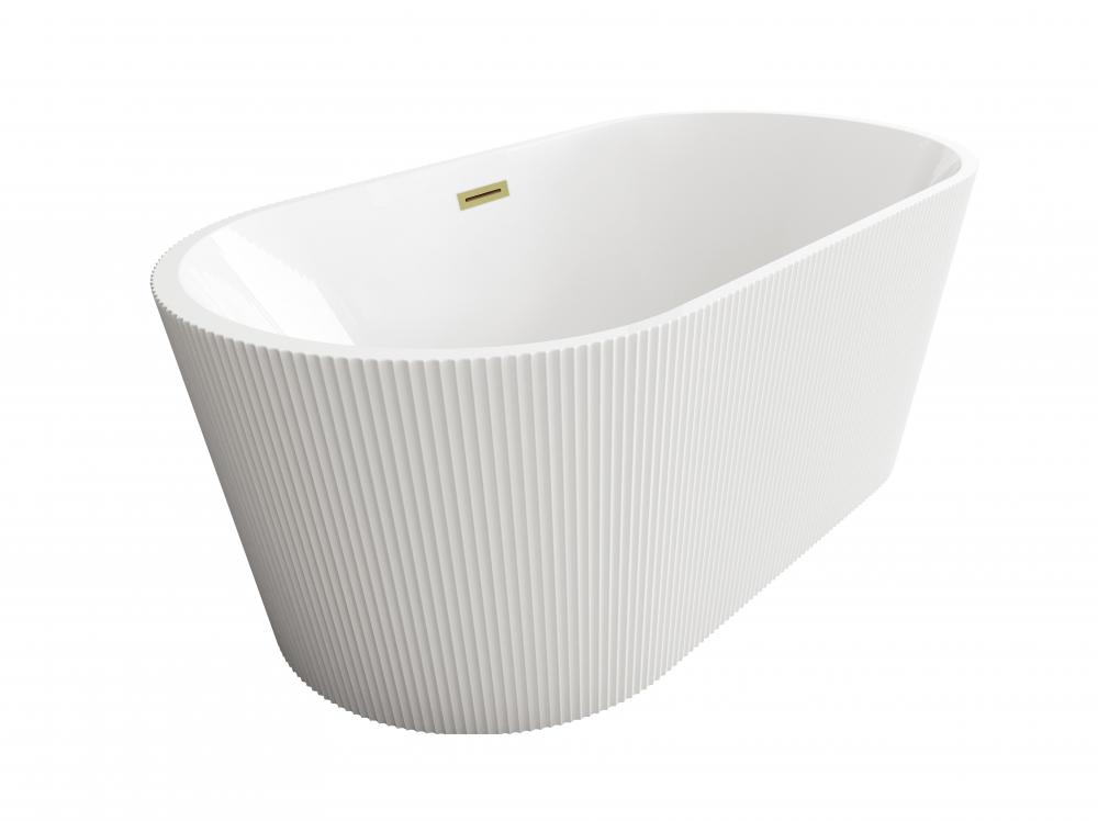 Elevate your bathroom’s aesthetic with this stunning freestanding soaking bathtub, featuring a vertical fluted exterior design that adds texture and sophistication to any space.