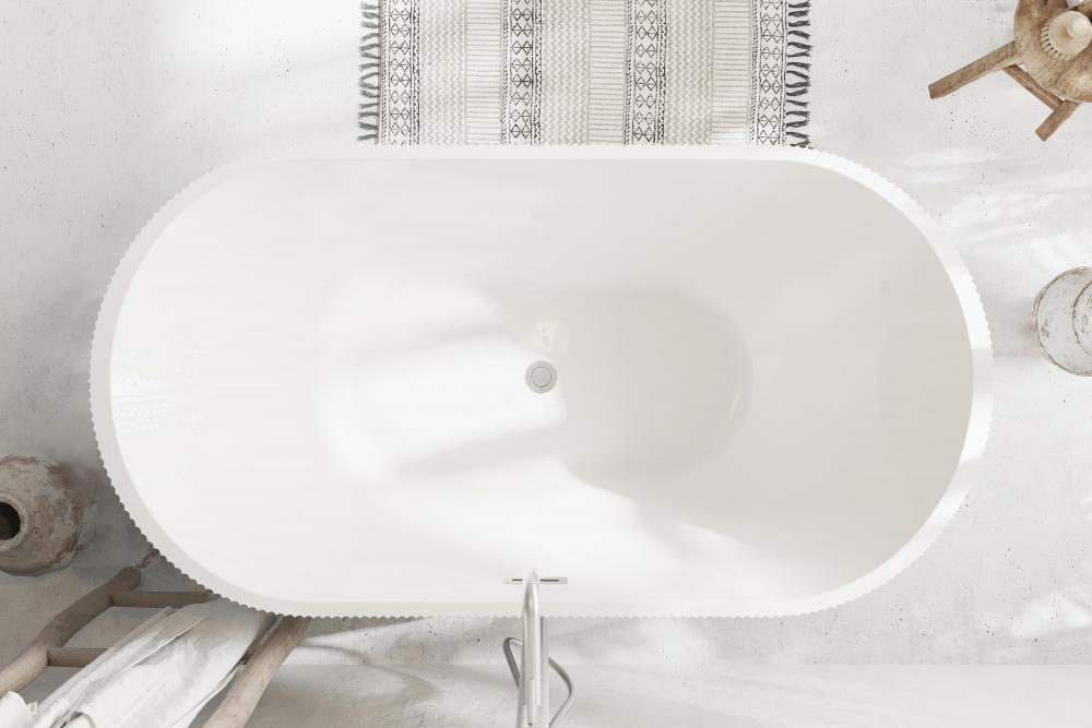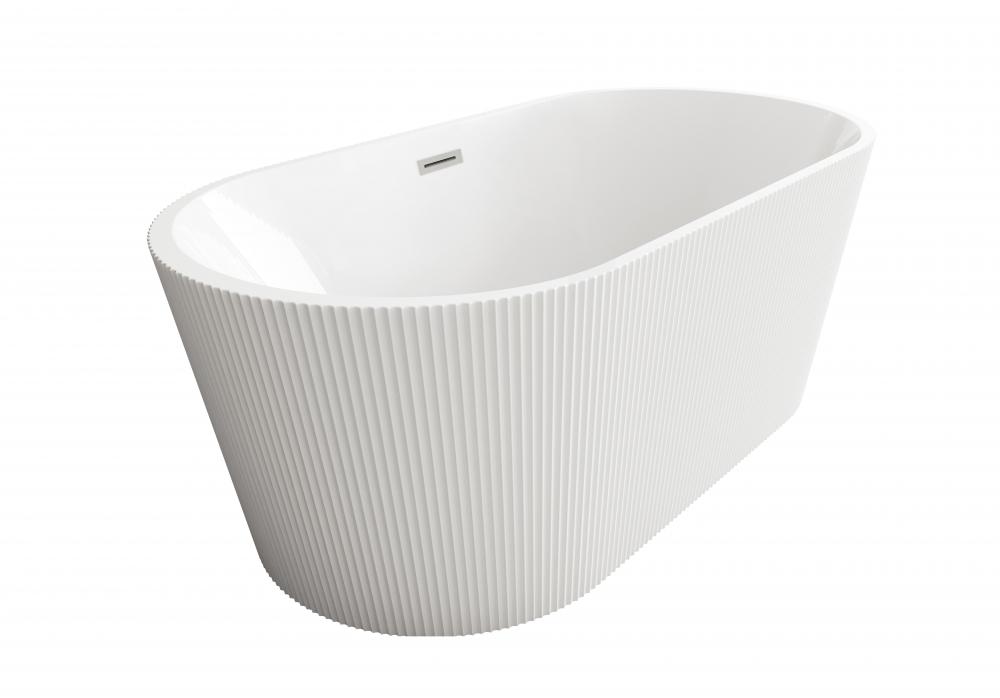 Elevate your bathroom’s aesthetic with this stunning freestanding soaking bathtub, featuring a vertical fluted exterior design that adds texture and sophistication to any space.