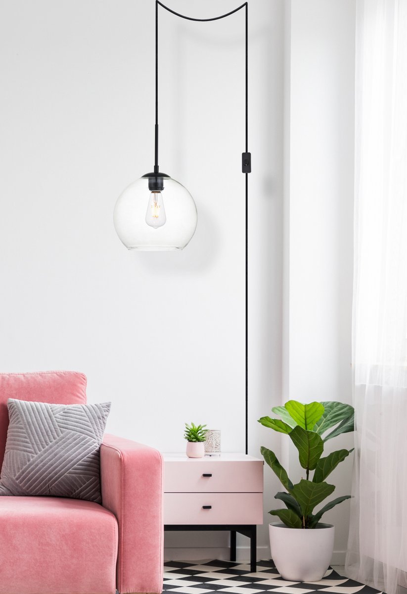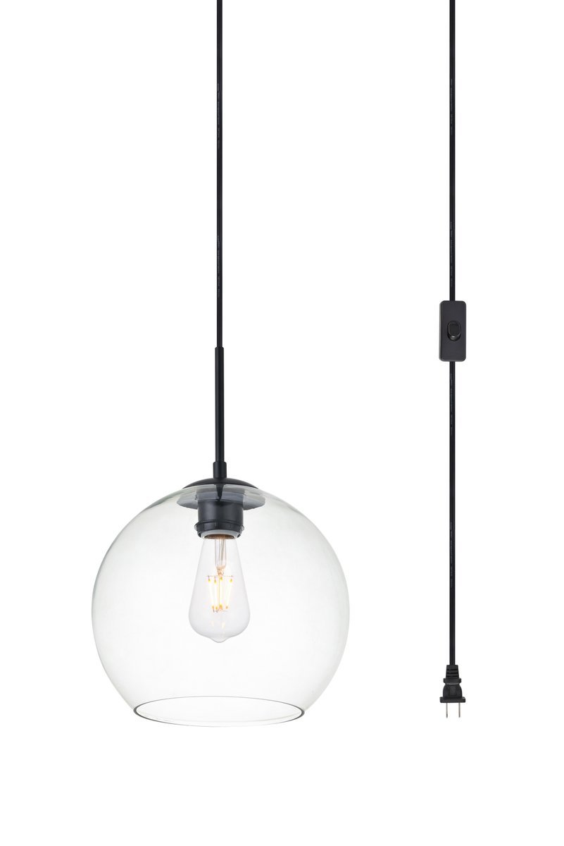 Refined style with a practical design, Baxter hanging pendant lamps bring cosmopolitan sophistication anywhere, especially to an entryway, office, bathroom, bedroom, or kitchen. The smooth iron frame comes in a black finish. An adjustable 15 foot black cord allows you to vary the hanging height. The clear spherical glass shade remains open at the center to allow for effortless replacement of the filament-style bulb (not included). Living in the big city has never been this easy. Plug-in design for easy access lighting with built-in on/off switch. Simply hang this piece on the provided swag hooks and plug it in for an effortlessly easy installation - can be hung from a sloped or vaulted ceiling.
