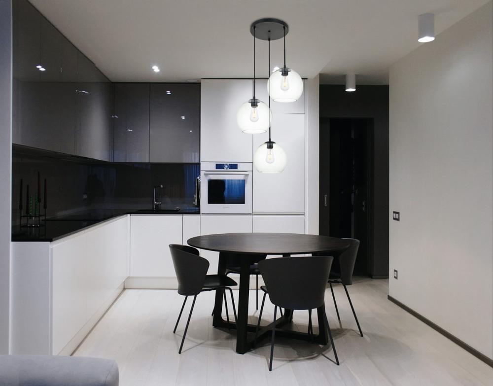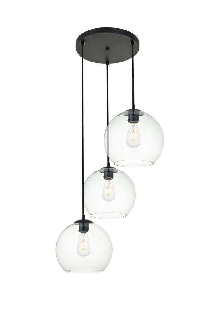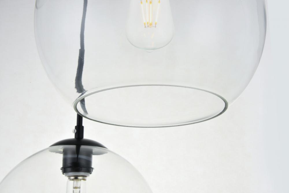 Refined style with a practical design, Baxter hanging pendant lamps bring cosmopolitan sophistication anywhere, especially to an entryway, office, bathroom, bedroom, or kitchen. The smooth iron frame features a disk-shaped canopy and comes in a black finish. Adjustable black cords allow you to modify the hanging height from 16 to 89 inches. Three identical clear spherical glass shades are suspended at varying heights and remain open at the center to allow for effortless replacement of the filament-style bulbs (not included). Living in the big city has never been this easy.