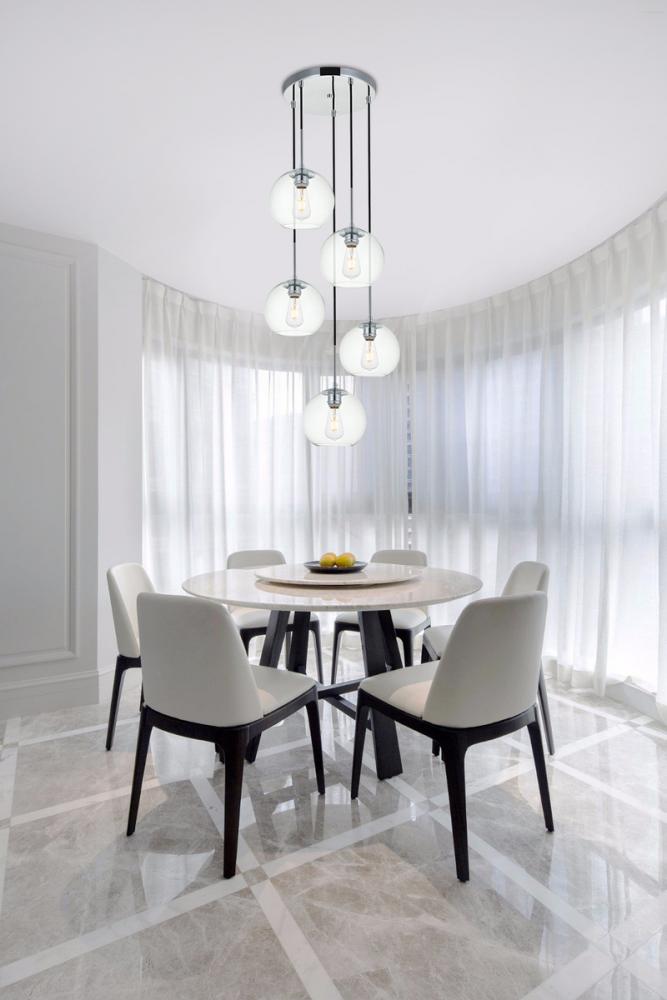Refined style with a practical design, Baxter hanging pendant lamps bring cosmopolitan sophistication anywhere, especially to an entryway, office, bathroom, bedroom, or kitchen. The smooth iron frame features a disk-shaped canopy and comes in a chrome finish. Adjustable black cords allow you to modify the hanging height from 14 to 87 inches. Five identical clear spherical glass shades are suspended at varying heights and remain open at the center to allow for effortless replacement of the filament-style bulbs (not included). Living in the big city has never been this easy.
