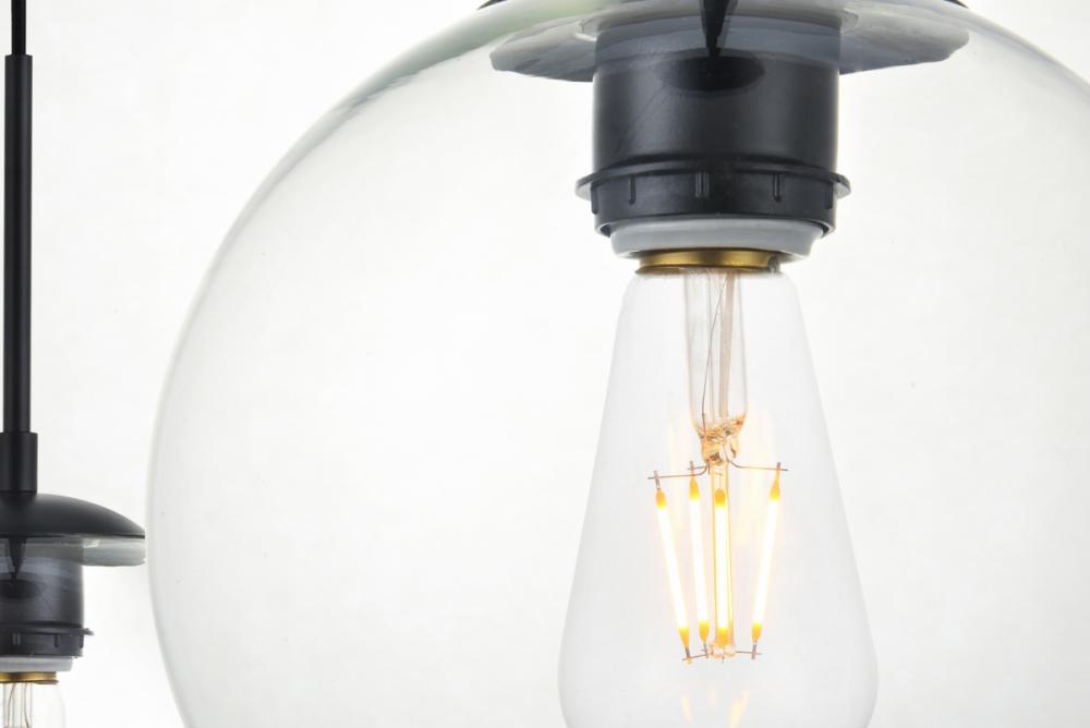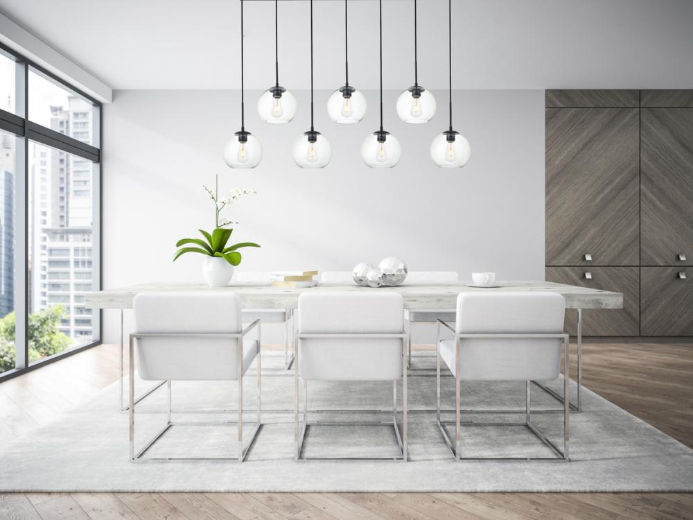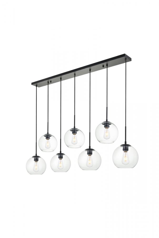 Refined style with a practical design, Baxter hanging pendant lamps bring cosmopolitan sophistication anywhere, especially to an entryway, office, bathroom, bedroom, or kitchen. The smooth iron frame features a rectangular canopy and comes in a black finish. Adjustable black cords allow you to vary the hanging height from 14 to 87 inches. Two staggered rows of seven identical clear spherical glass shades remain open at the center to allow for effortless replacement of the filament-style bulbs (not included). Living in the big city has never been this easy.