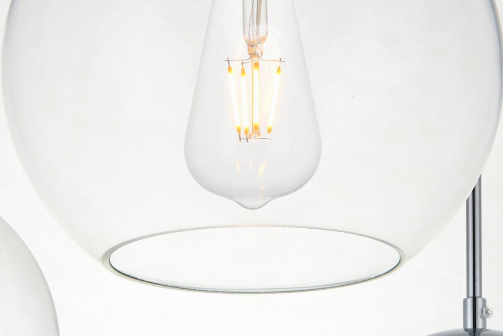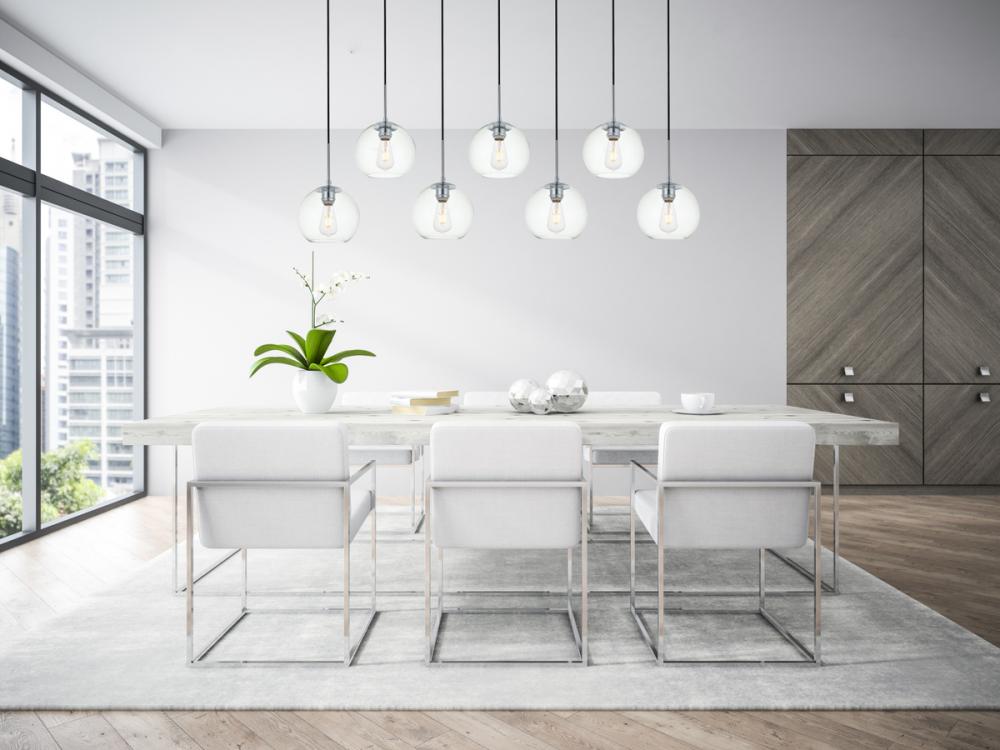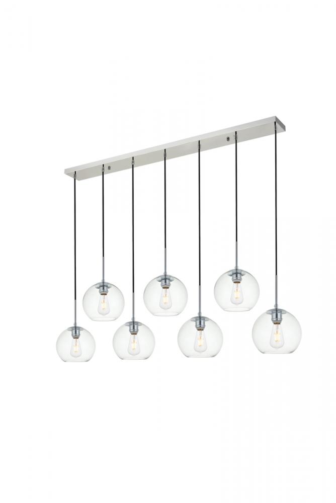 Refined style with a practical design, Baxter hanging pendant lamps bring cosmopolitan sophistication anywhere, especially to an entryway, office, bathroom, bedroom, or kitchen. The smooth iron frame features a rectangular canopy and comes in a chrome finish. Adjustable black cords allow you to vary the hanging height from 14 to 87 inches. Two staggered rows of seven identical clear spherical glass shades remain open at the center to allow for effortless replacement of the filament-style bulbs (not included). Living in the big city has never been this easy.
