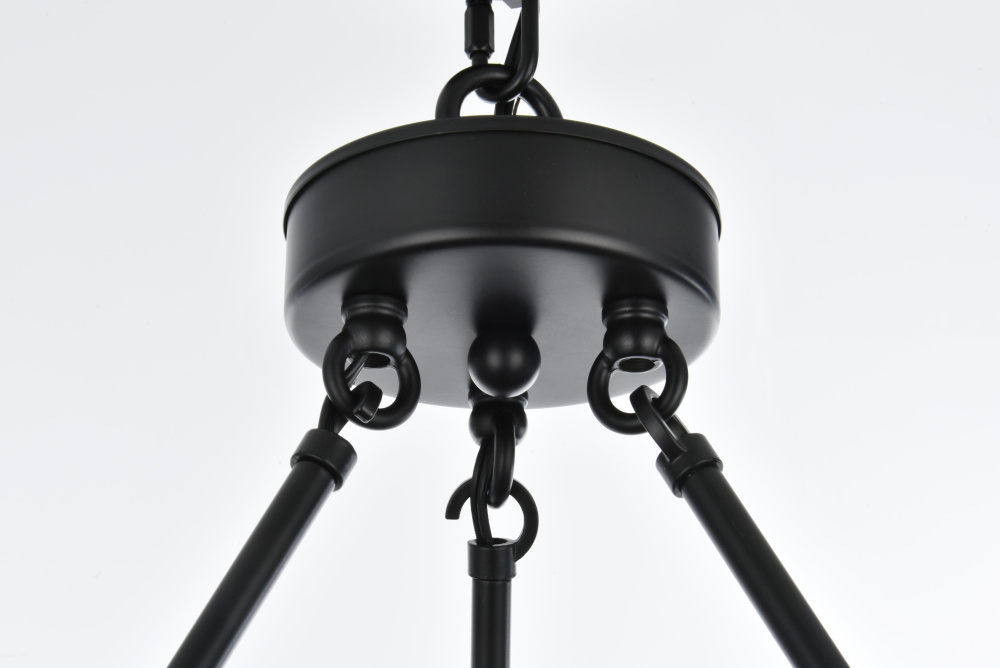 A bold statement piece, the black finish highlights the industrial and modern design while contrasting beautifully with the clear glass shades.