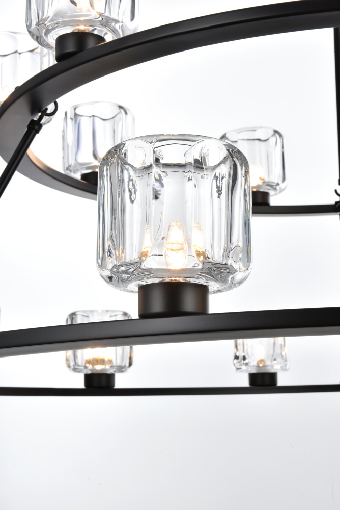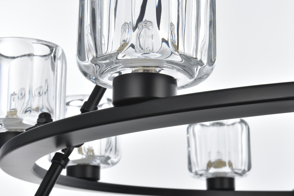 Add modern charm to your space with this striking chandelier, where a sleek circular iron frame meets sculpted clear glass shades. The unique design features decorative hanging rods with hooks, enhancing the structure with industrial flair. The clear glass refracts light beautifully, creating a radiant glow that uplights your space with warmth and dimension. Perfect for dining rooms, living rooms, or offices, this chandelier is available in black for a bold contrast, satin gold for a luxurious touch, and chrome for a sleek, modern vibe. With multiple size options and a matching canopy and chain for seamless installation, this dimmable chandelier offers both beauty and versatility. Light bulbs are not included, allowing you to choose the perfect style to match your vision.