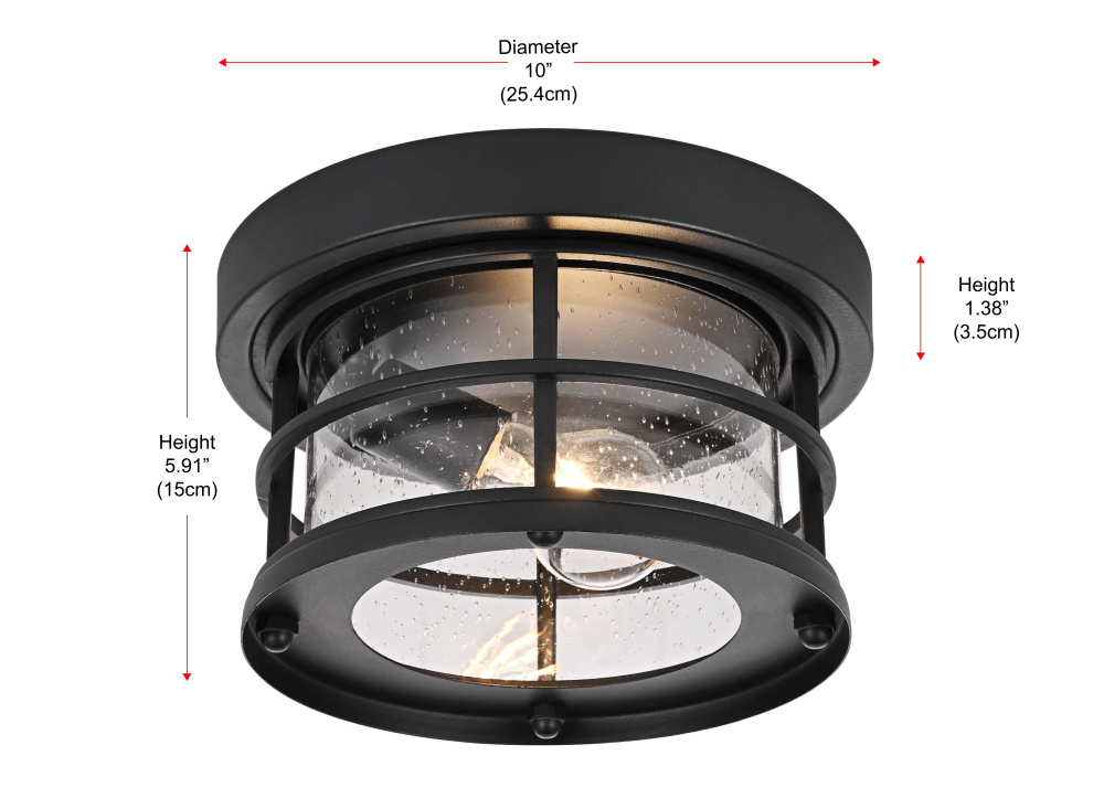 This outdoor flush mount light blends nautical and industrial influences, featuring a rounded frame with horizontal guard rails and a clear seedy glass cylinder for a structured yet functional look. The black-finished iron frame ensures durability, while the textured seedy glass enhances light diffusion, creating a warm, inviting glow. The open-bottom design allows for quick bulb changes, and the flush mount installation makes it a great choice for low-ceiling outdoor spaces such as covered porches, patios, and entryways. Designed for an E26 base bulb (not included), this fixture is also dimmable, offering adjustable brightness levels. ETL Damp Rated, this light is built to withstand moisture and outdoor conditions, making it a reliable and well-structured addition to any exterior setting. Built with marine-grade, corrosion-resistant aluminum, this sconce withstands coastal conditions for long-lasting durability.