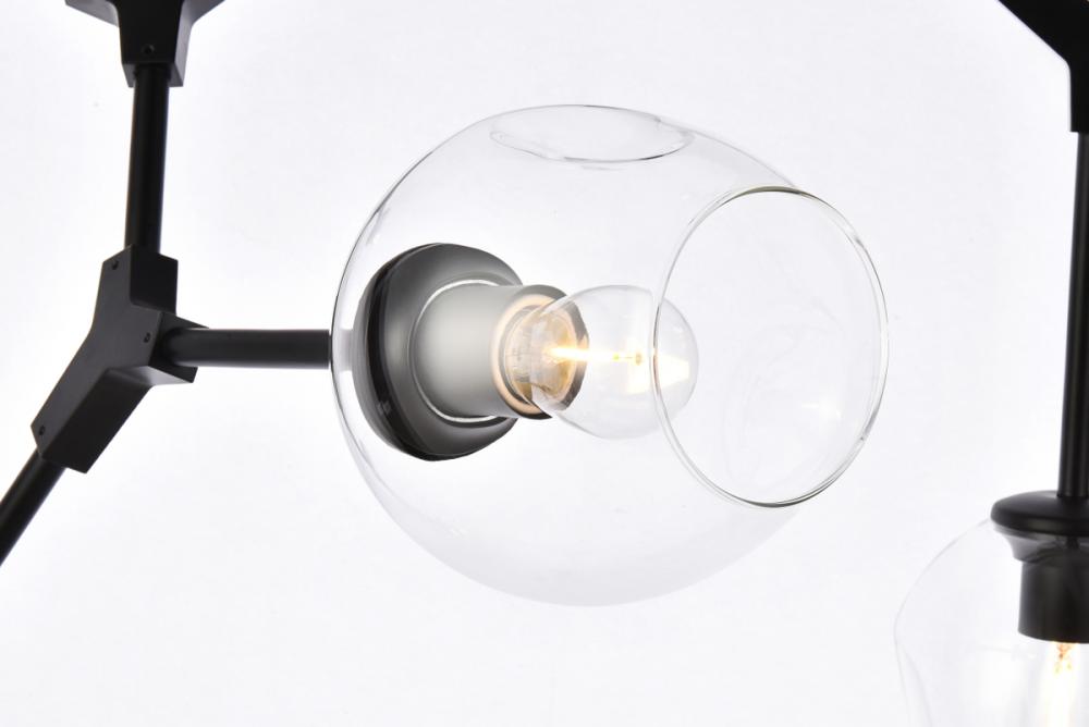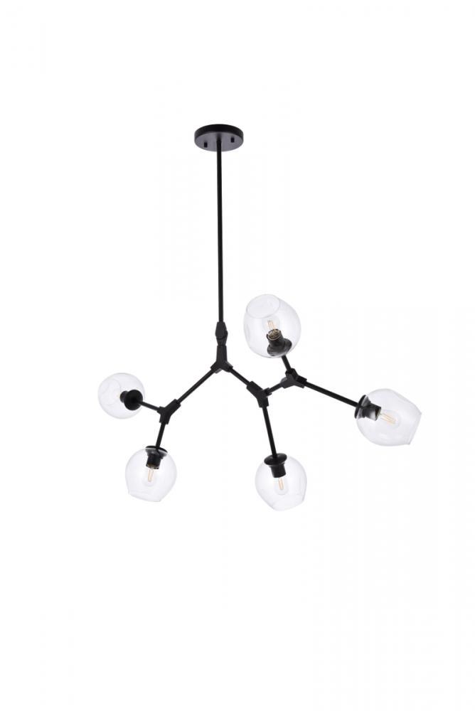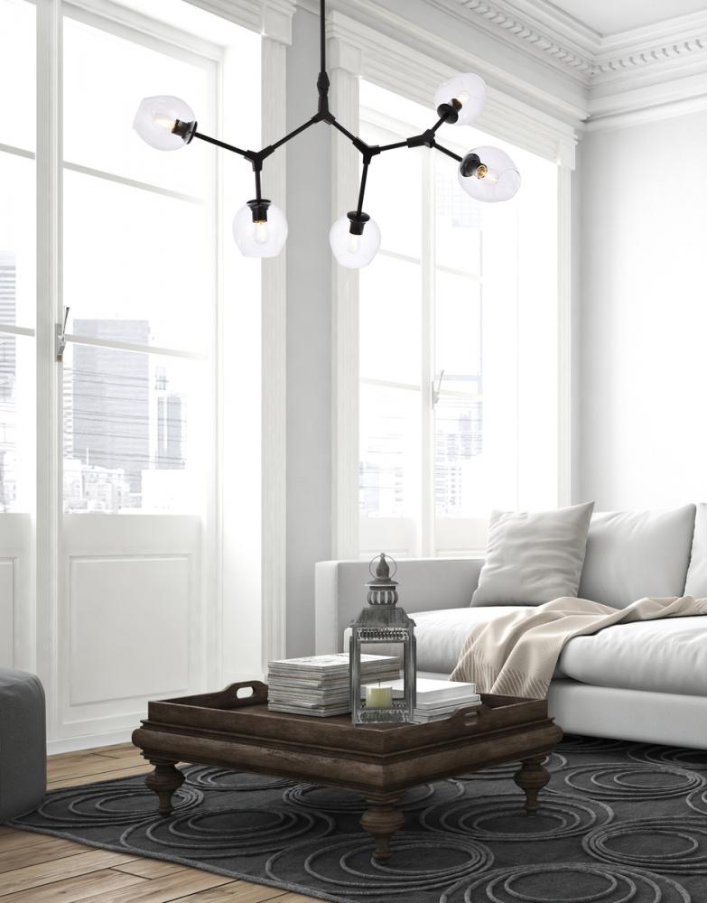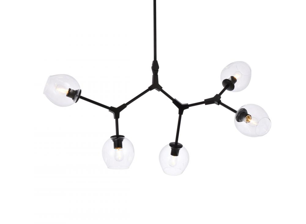 The daring Cavoli pendant lamp in a flat black finish is designed with 5 lights that connect at various angles, illuminating your rooms and ridding them of darkness. The winding paths end with a light encapsulated within a clear shade at each point. This contemporary blend of art and function results in this light that will shine beautifully in any space it adorns.