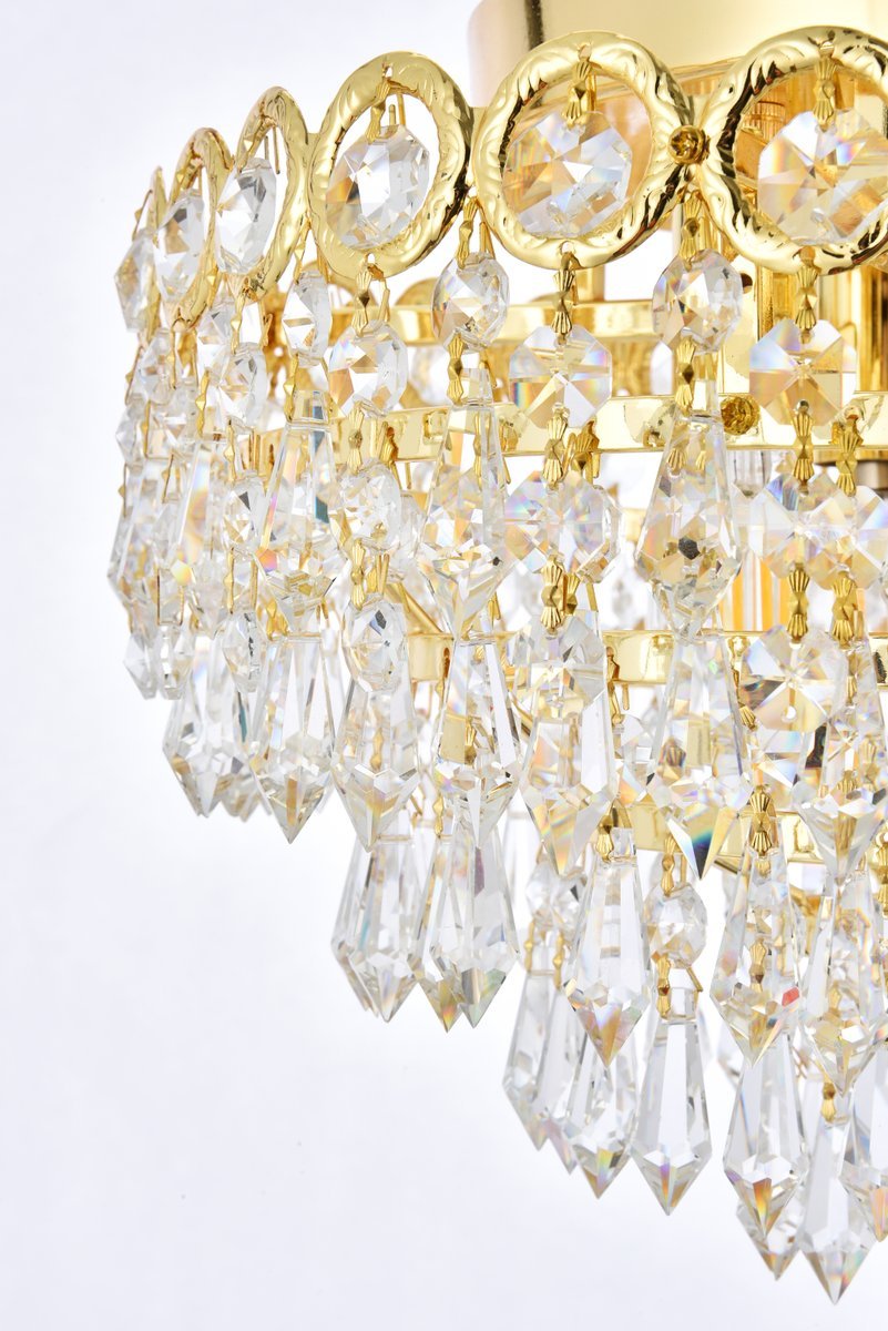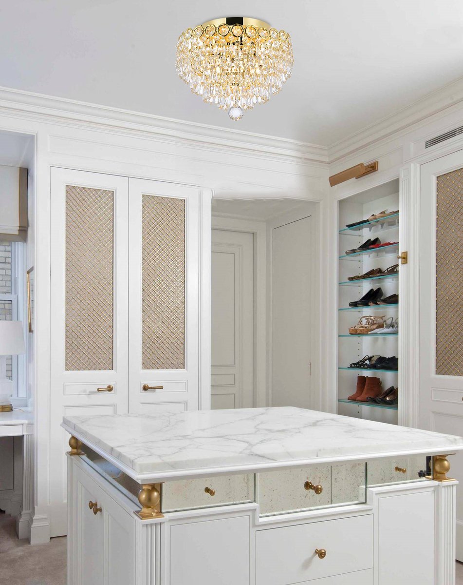 Century collection flush-mount fixtures, inspired by the classic elegance of 19th-century France, offer the versatility and adaptability to add splendor to many areas of your home. The glimmering hemisphere design is ablaze in a profusion of clear crystal octagons and prisms in a wide variety of trims, with the descending tiers all coming together in a Single faceted crystal ball. The candelabra bulbs give off the glowing hue of the frame, finished in gold or chrome.