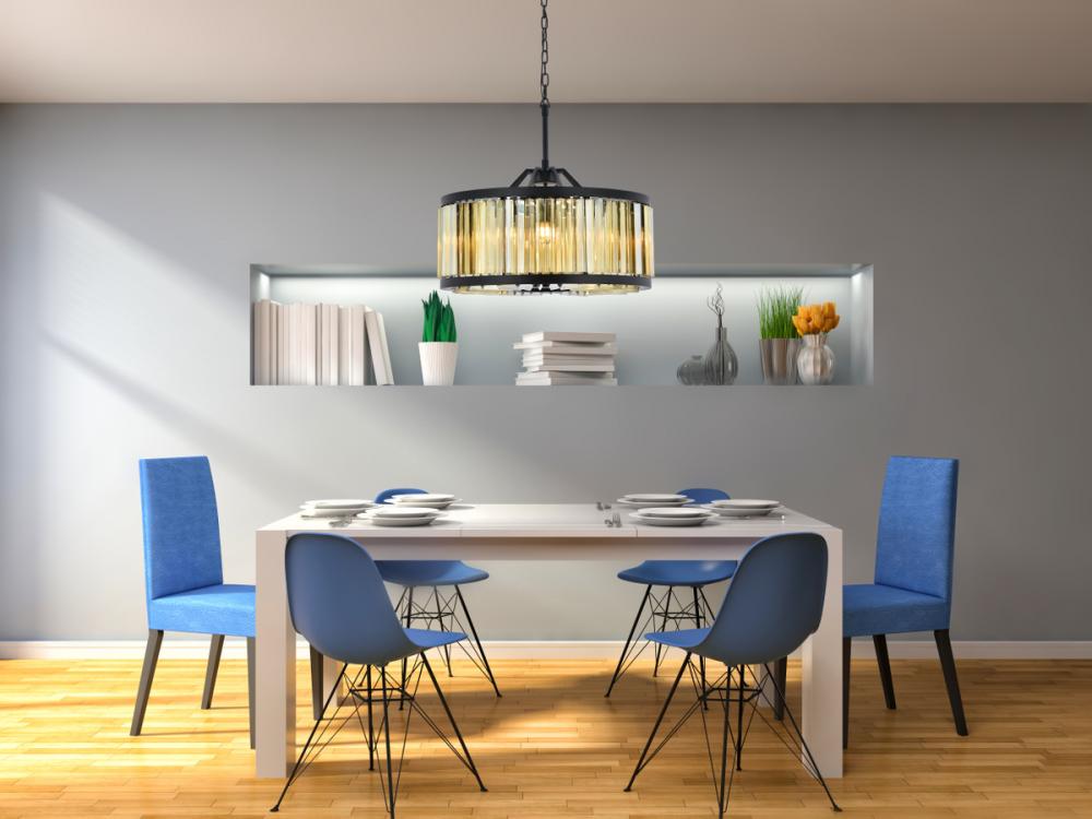 An infinity of light, caught in a circle of crystal bars in clear, golden teak, or Silver shade, the Chelsea collection will bring a shimmer of brilliance to your home. The circular steel frame in a Matte Black or polished-nickel finish lends subtle strength to this chandelier design. The Chelsea collection adds transitional grace especially to a kitchen, bedroom, or dining room.