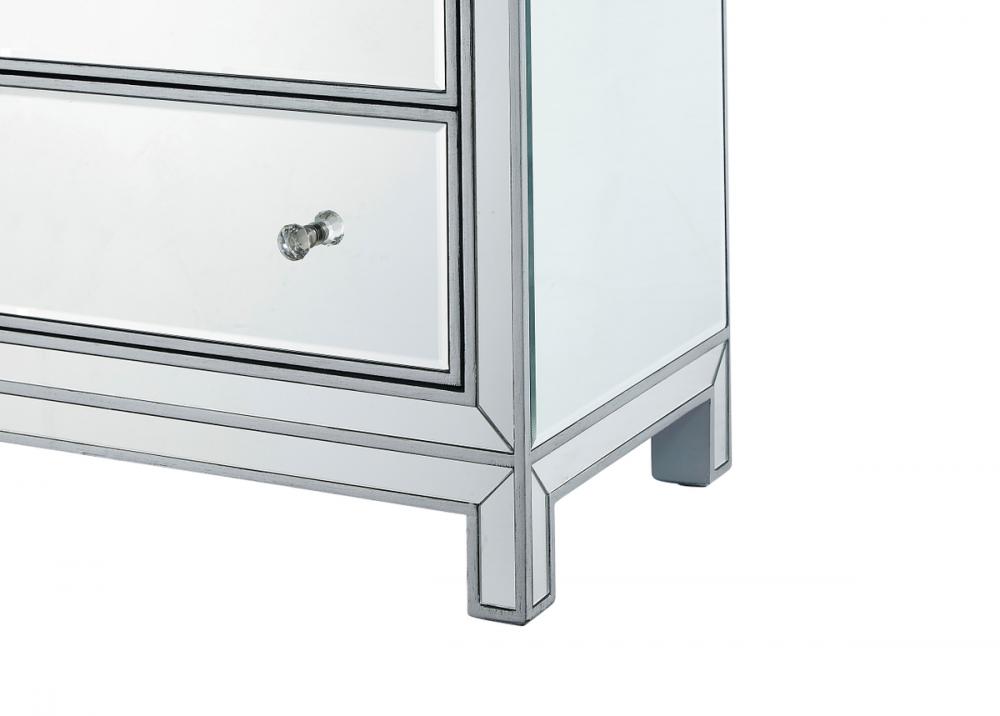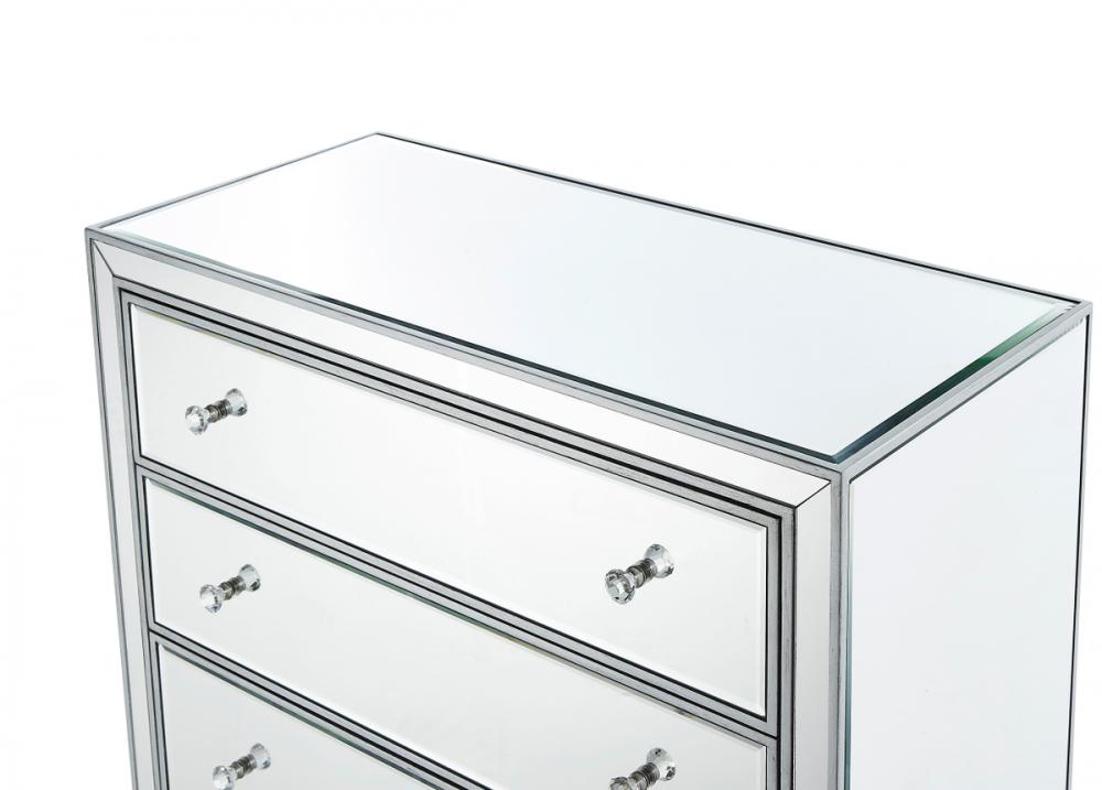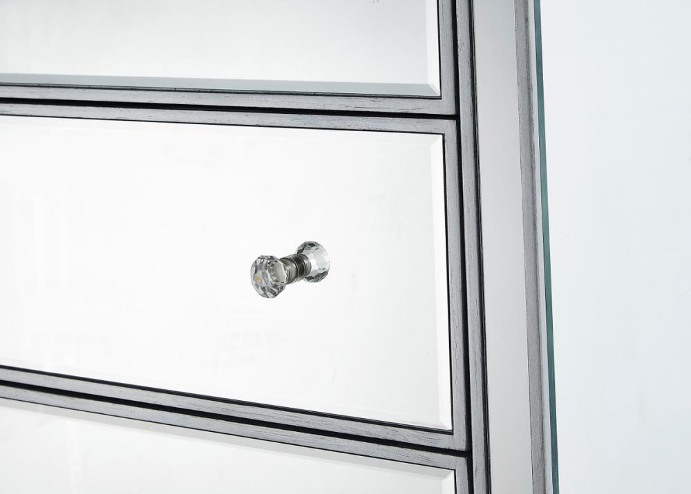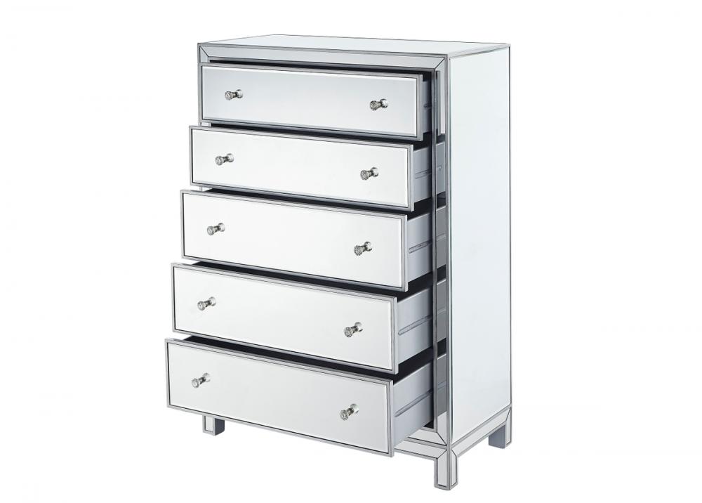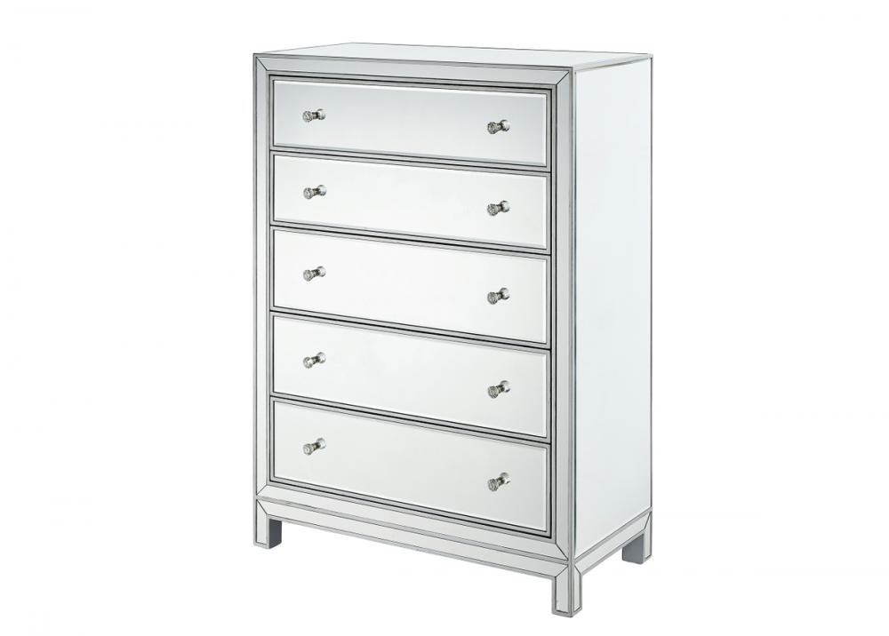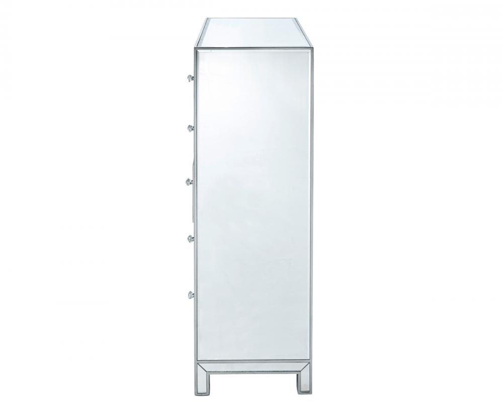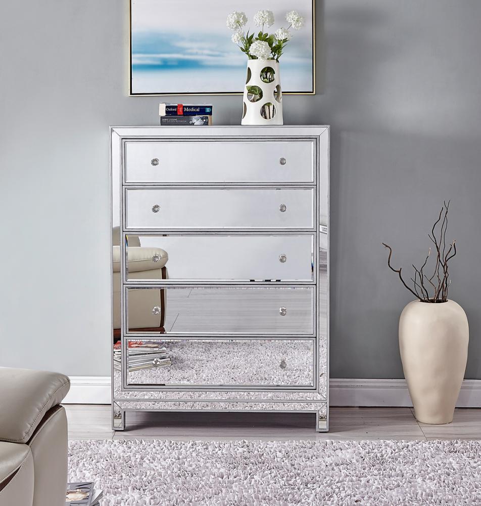 A perfect combination of style and functionality, this five drawer dresser provides plenty of storage space. The high quality beveled mirror panels are enhanced with hand paintedSilver trims. The crystal knobs, in addition to the distinctive mitered corners, evoke richness and class! FEATURES: *Reflexion collection *5 drawers * crystal drawer knobs *Hand brushedSilver trim and frame *Beveled mirror panel *Solid wood frame and legs *Wood drawer glides *drawer lining painted in silver. PRODUCT DETAILS: Measurement W34xD16xH48” *No assembly required *Material in solid wood and engineered wood *1 year limited product warranty.