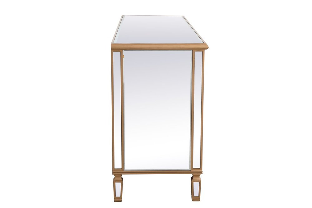 Crafted with mdf, solid wood legs, clear mirror panels, and crystal knobs