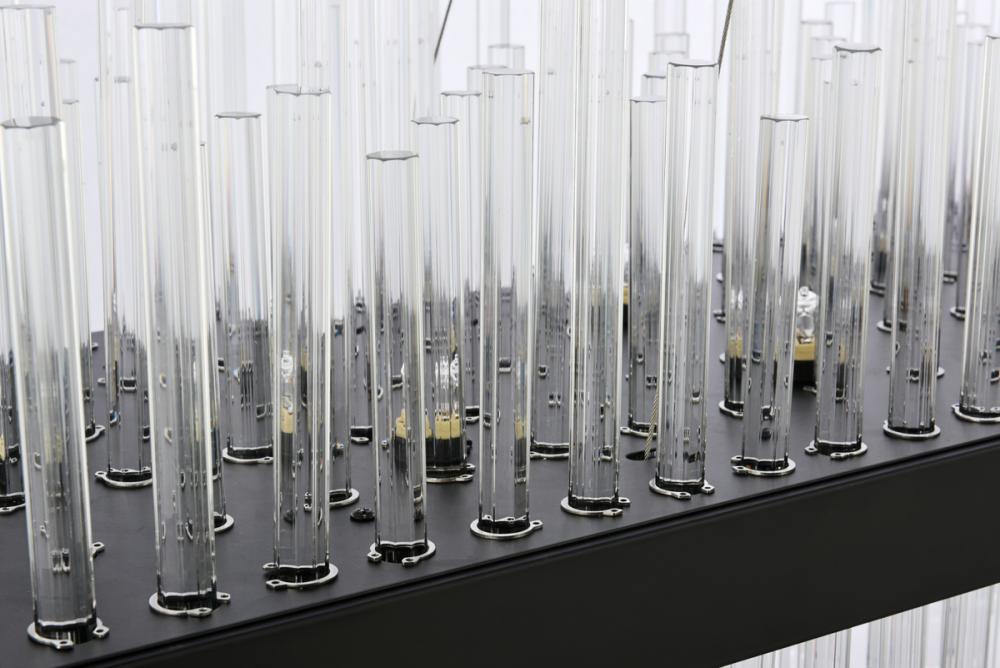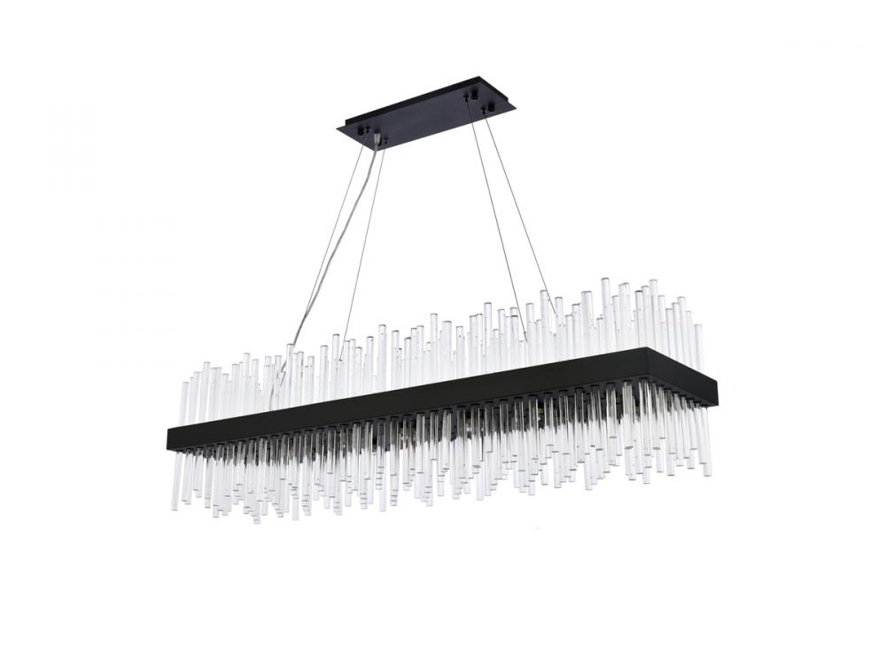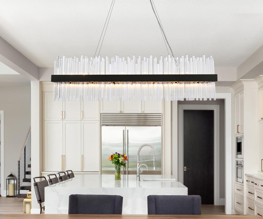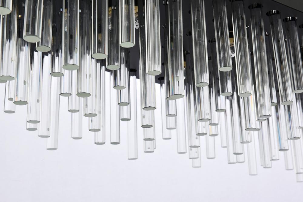 This stately fixture combines timeless elegance with modern and attractive sophistication. The delicate juxtaposition of upright and hanging clear glass rods creates a truly stunning visual statement, seamlessly woven together within a sleek bold metal frame. This expressive piece would be a welcomed and treasured addition to a wide range of modern residential styles.