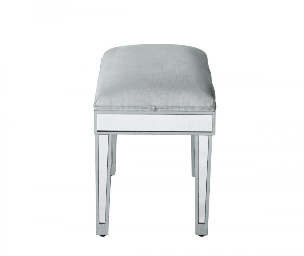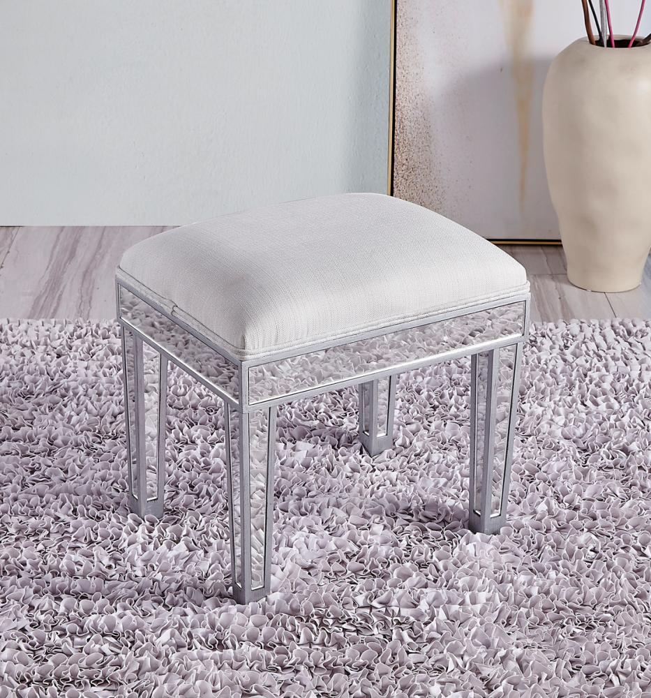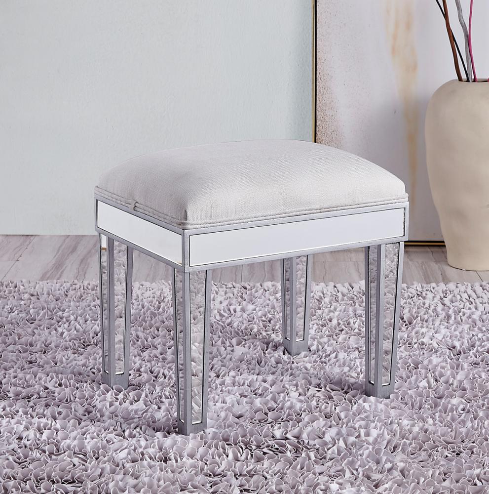 Stylish and versatile, this upholstered stool is perfect for use with a dressing table, desk, coffee table, or a small ottoman. Measuring L18xW14xH18”, this stool is covered by linen and cotton blend fabric, adding a velvety softness and comfort. FEATURES: *Reflexion collection Upholstered with cotton and linen blend *Hand rubbed silver finish *Top-quality mirror panel *Solid wood trim and legs PRODUCT DETAILS: Measurement L18xW14xH18” *Minor assembly required *Material in kiln-dried solid wood and engineered wood * 1 year limited warranty.
