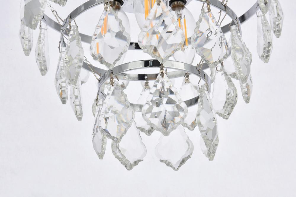 Tiers of clear multi-faceted crystals reflect the soft glow of candelabra bulbs