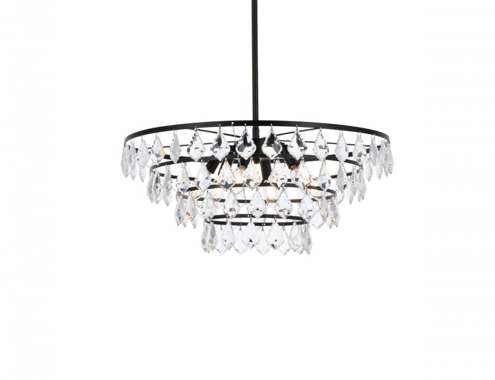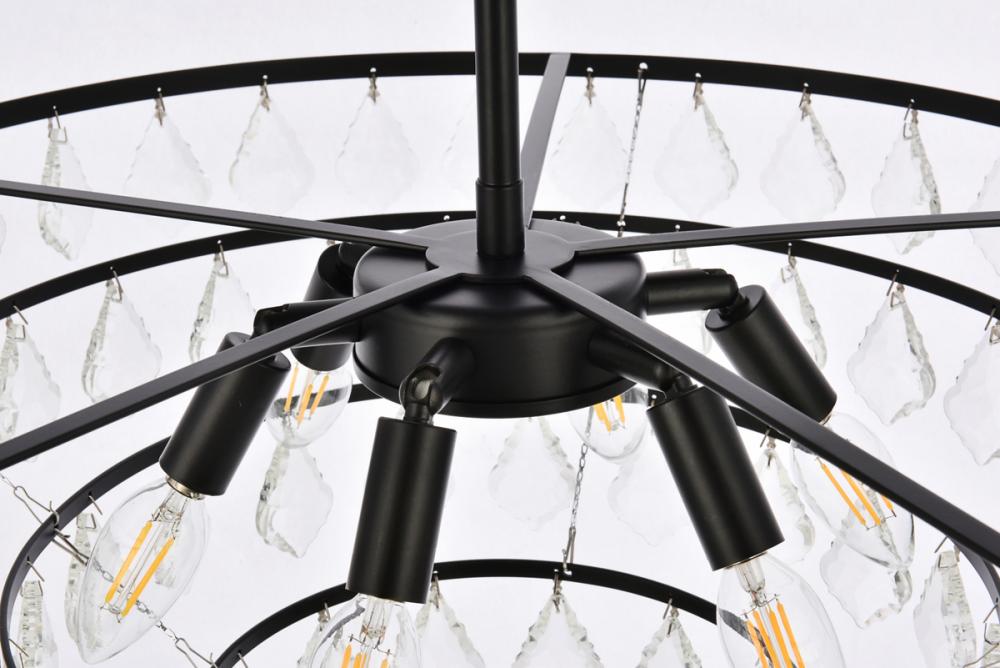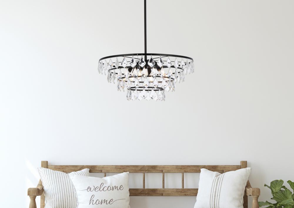 Tiers of clear multi-faceted crystals reflect the soft glow of candelabra bulbs