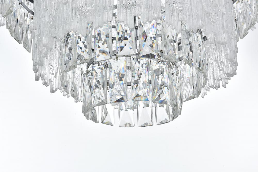 Transform your home with the opulent charm of this indoor lighting, meticulously designed to make a statement in any space. The light fixture showcases an intricate array of precision-cut clear crystals, each expertly faceted to maximize light refraction and create a dazzling display of brilliance. These crystals are complemented by textured glass accents that add depth and visual interest, casting a soft, shimmering glow across the room. Available in your choice of chrome or satin gold finishes, it is the epitome of luxury and modern elegance. As part of a coordinated collection, it also includes matching chandeliers, wall sconces and flush mounts, allowing you to create a harmonious lighting scheme throughout your home.