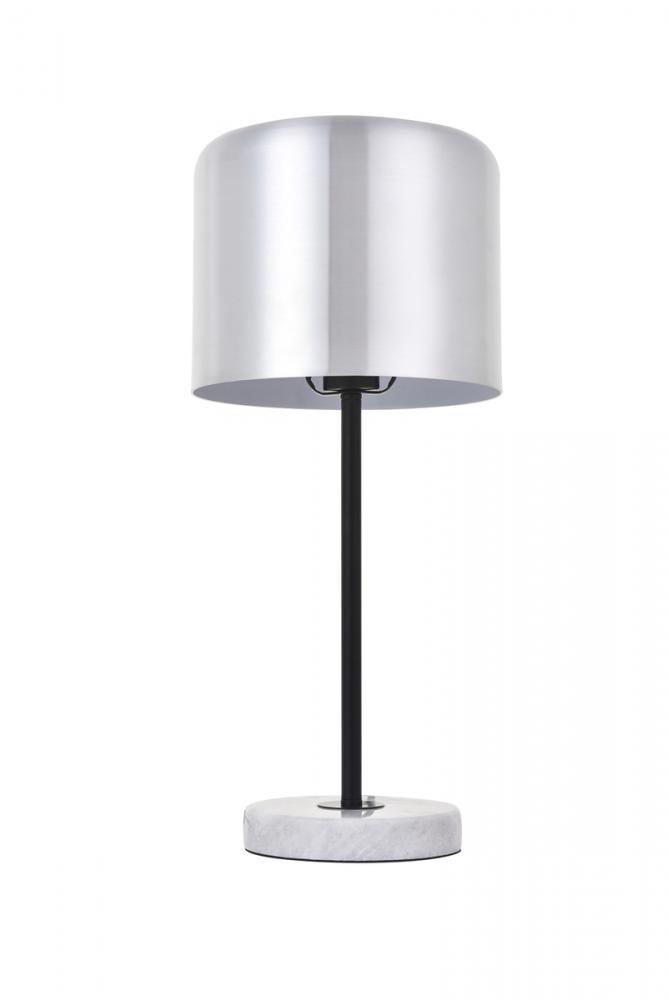 Contemporary brushed nickel finish table lamp with a cylinder shaped shade and white carrera marble base