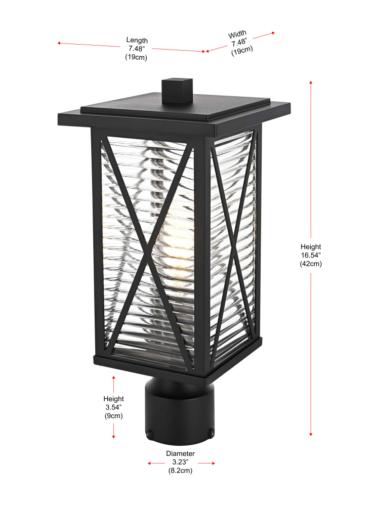 This outdoor post light blends classic lantern styling with modern craftsmanship, featuring a rectangular metal frame, fluted glass panels, and crisscross detailing. The clear fluted glass creates a rippled effect, diffusing the light for a balanced glow while maintaining brightness. Crafted from iron and aluminum, the sturdy black-finished frame ensures long-term durability in outdoor conditions. The 3.23-inch wide base fits most standard post light poles (pole not included), making installation straightforward. This fixture is dimmable and requires one medium-base E26 bulb (not included), offering flexibility in brightness and bulb selection. ETL Wet Rated, this pendant light brings a structured and refined presence to exterior spaces. Built with marine-grade, corrosion-resistant aluminum, this sconce withstands coastal conditions for long-lasting durability.