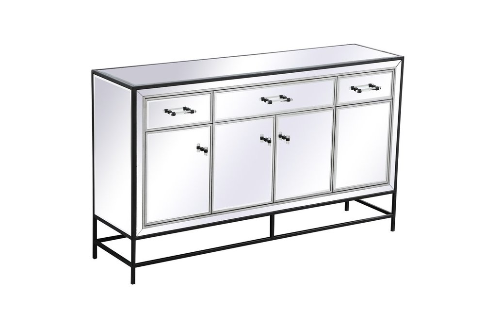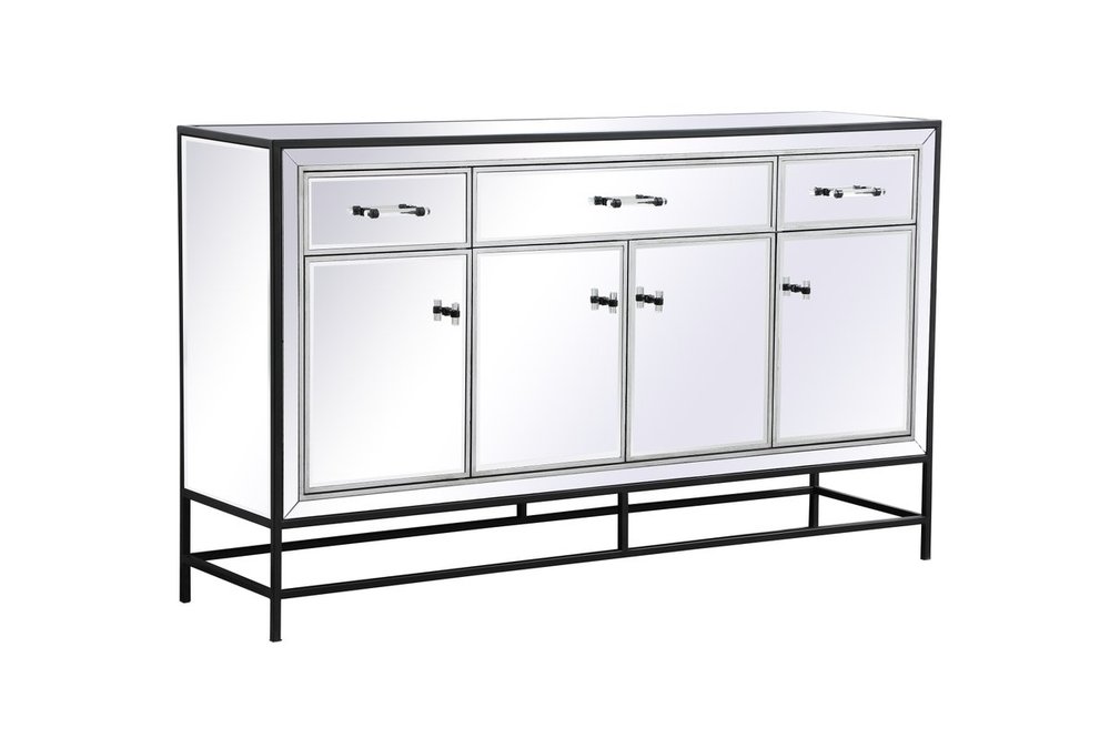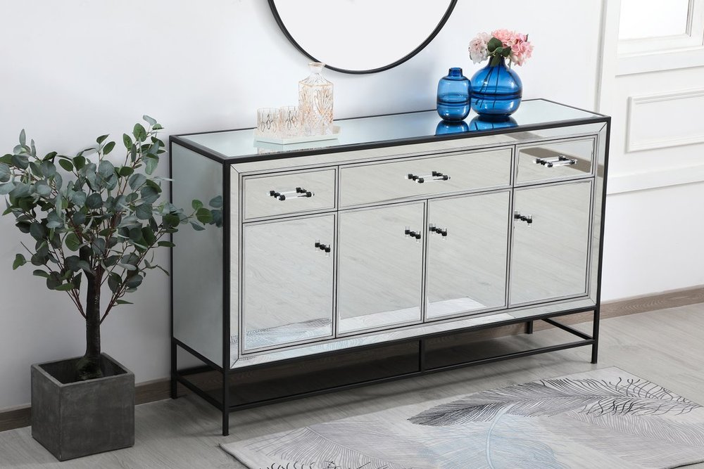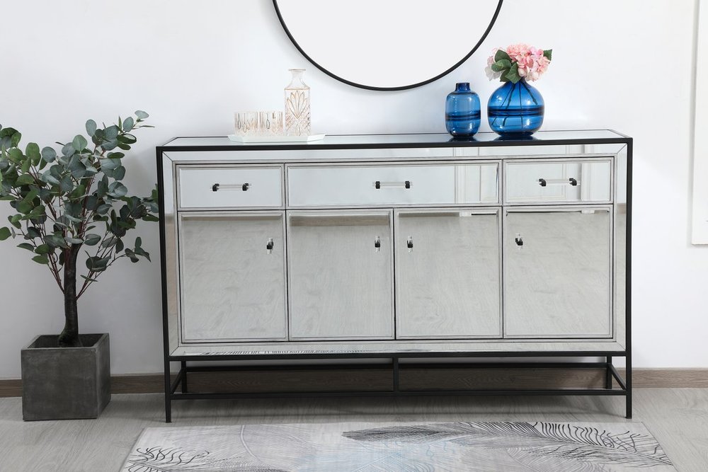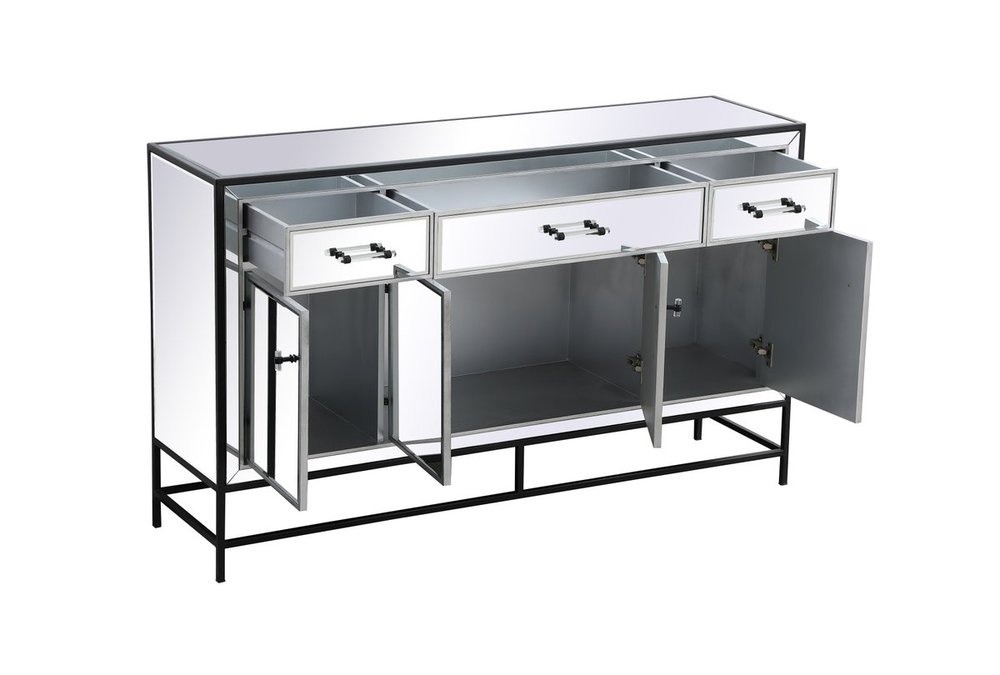Bring plenty of storage space and modern style to your living room, dining room or entryway with this mirrored credenza. This was made to withstand everyday use. Deep drawers to hold up to 66 pounds and opens quietly. Four doors open to reveal one shelf in each cabinet for barware, fine china, and table linens. This versatile credenza blends in easily with any décor and easy to maintain. Ships fully assembled and ready to use. With anti-tip straps included for added security, this modern addition will complete your room.
