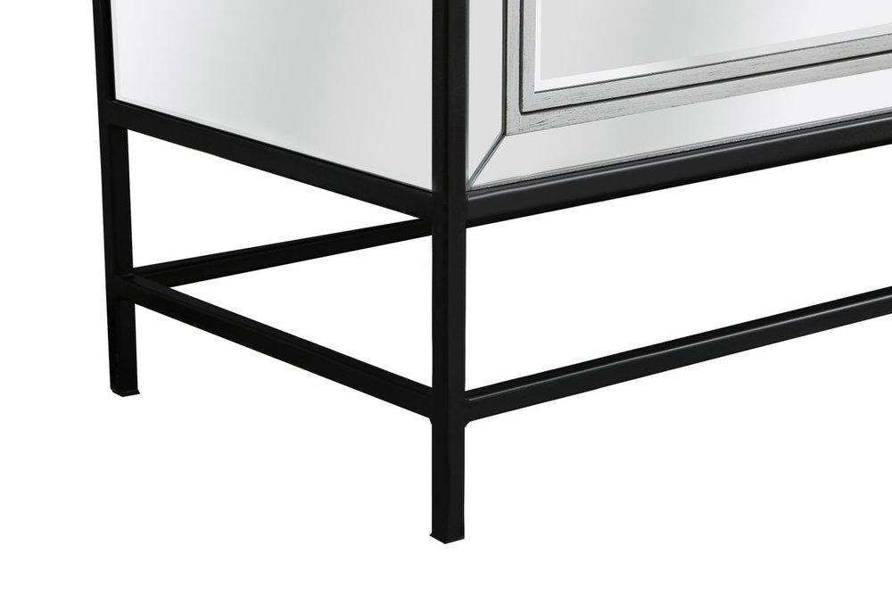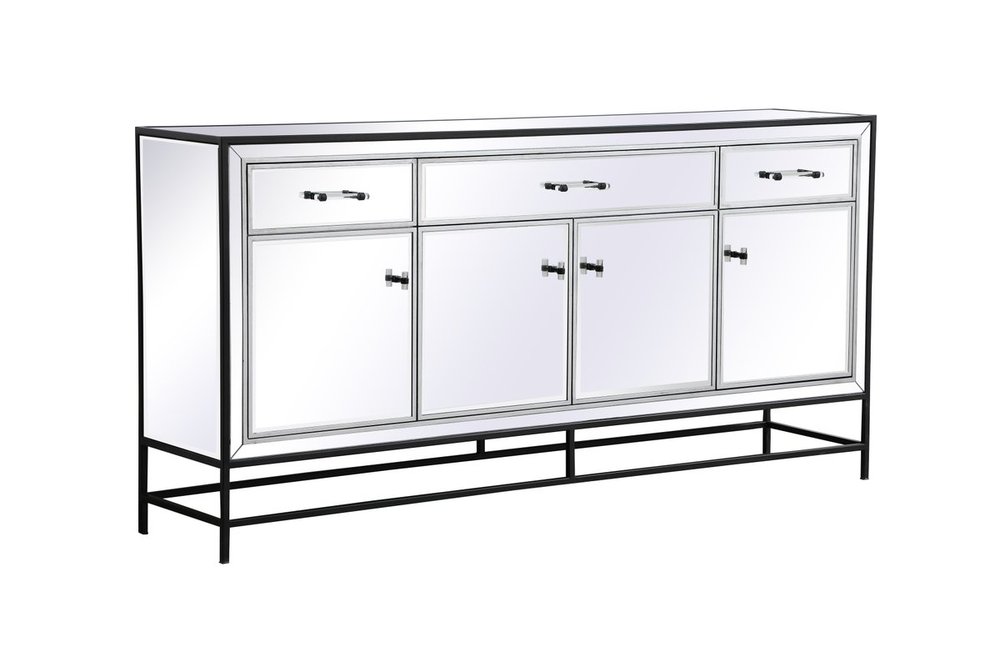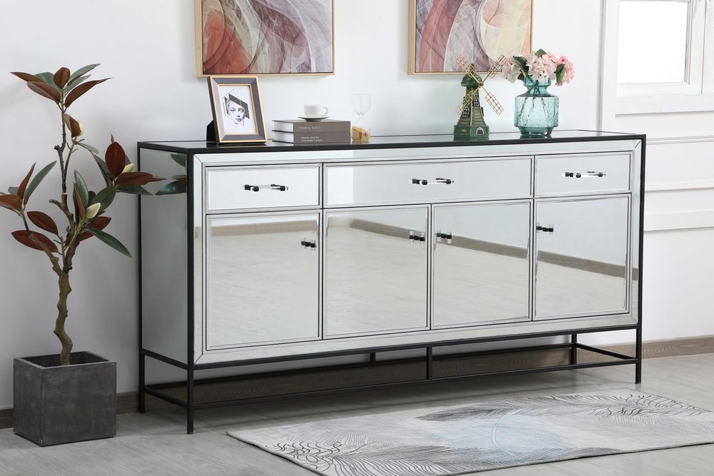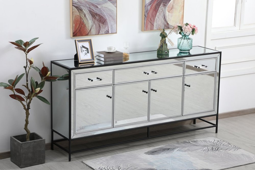 Bring plenty of storage space and modern style to your living room, dining room or entryway with this mirrored credenza. This was made to withstand everyday use. Deep drawers to hold up to 66 pounds and opens quietly. Four doors open to reveal one shelf in each cabinet for barware, fine china, and table linens. This versatile credenza blends in easily with any décor and easy to maintain. Ships fully assembled and ready to use. With anti-tip straps included for added security, this modern addition will complete your room.