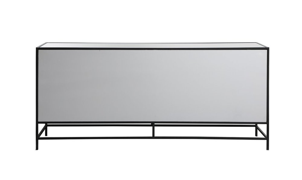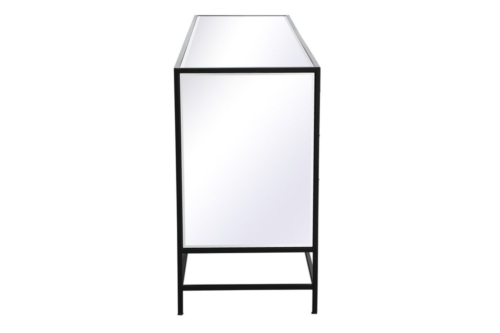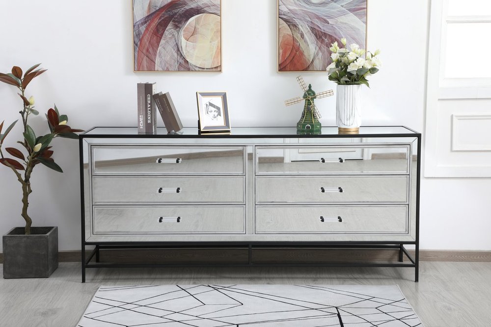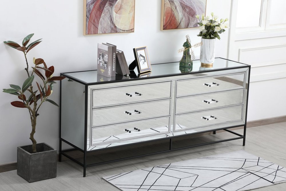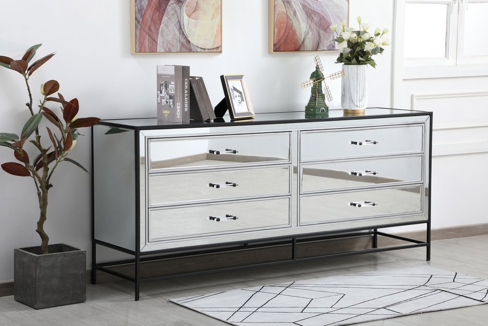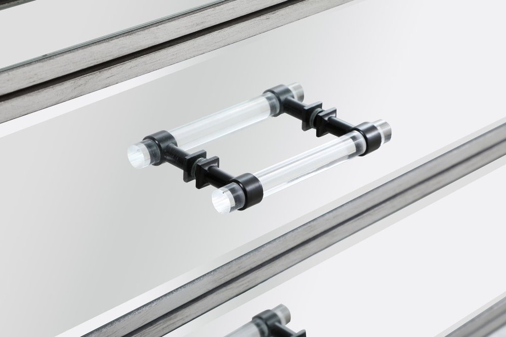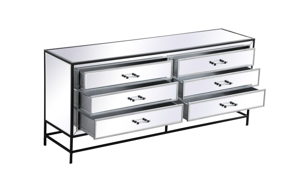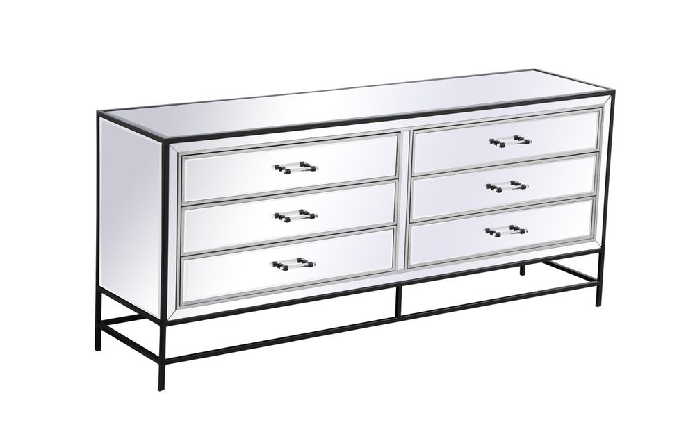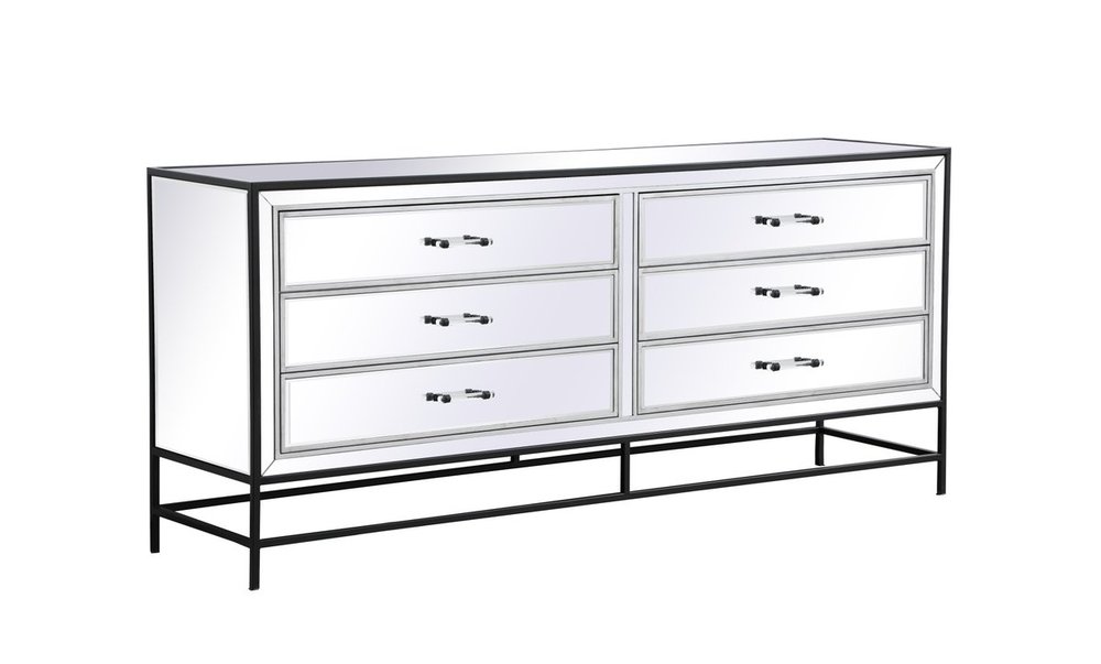 Crafted with mdf, clear mirror panels, and acrylic knobs with metal accents