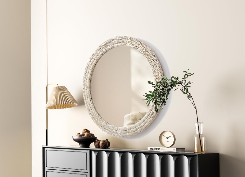 Transform your space with this stunning wall mirror that blends natural charm with functional design. Crafted from MDF, cornhusk, and high-quality mirror, the textured woven frame brings warmth and character to your decor. Whether you're decorating a hallway, living room, or bedroom, this mirror comes in a variety of shapes—including rectangle, round, oval, and arch—along with multiple size options to perfectly suit your needs. Designed for versatility, the mirror features two inset metal hangers, allowing you to mount it vertically with ease. Its reflective surface not only adds a touch of brightness but also creates the illusion of a larger room, enhancing your space. with durable materials and ready-to-hang hardware, this mirror is as practical as it is stylish, making it a must-have piece for any home.