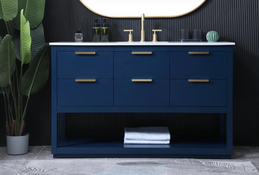 Featuring an open shelf at the bottom for extra storage, the vanity provides a convenient space to showcase decor or store essentials, adding functionality and style to your bathroom.