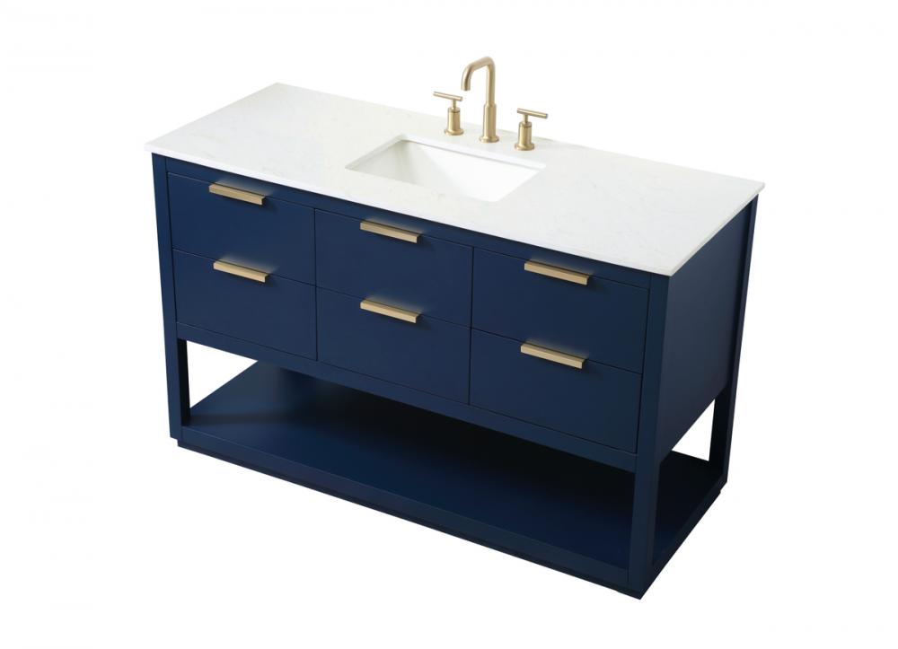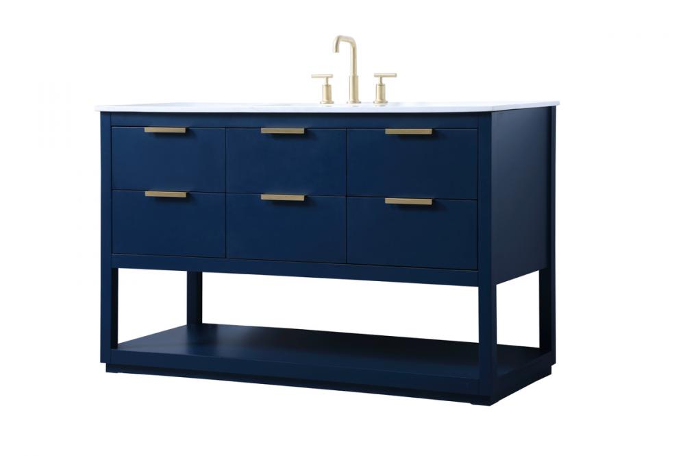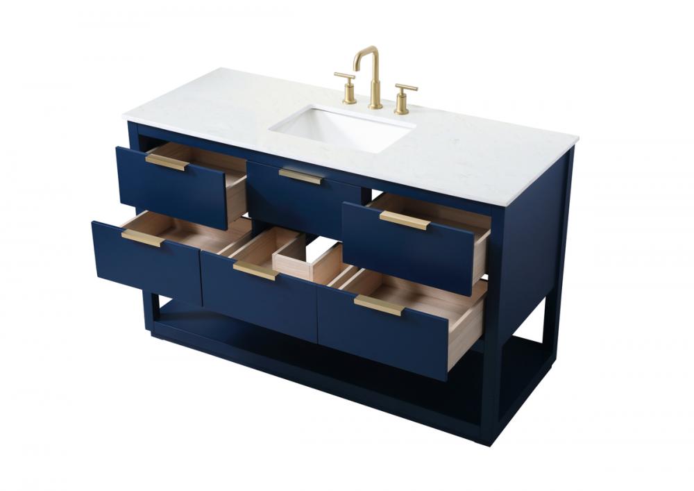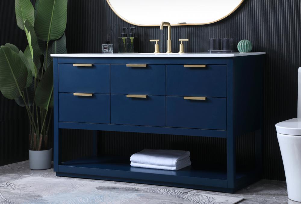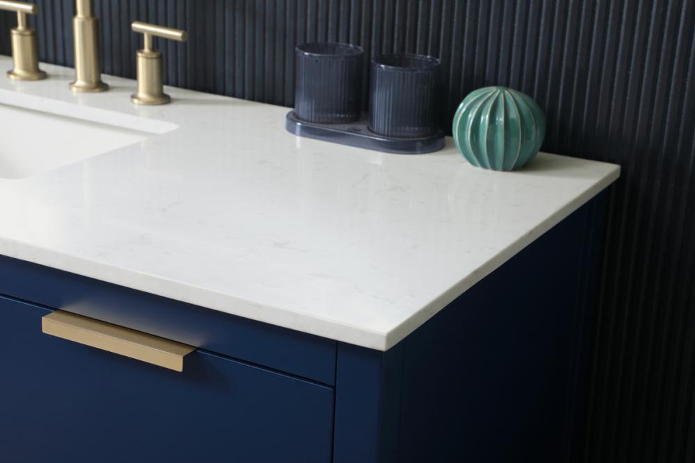 Elevate your bathroom effortlessly with our stylish vanity. Featuring an engineered marble top and chic straight edge cut, it brings a touch of modern elegance. The soft-close drawers, adorned with sleek pulls, offers both convenient storage and a contemporary aesthetic. Completing the ensemble, an undermount porcelain sink adds timeless charm. The vanity's open shelf at the bottom provides extra storage and a space to showcase decor. As a freestanding unit, this hassle-free solution requires no assembly. Customize your space effortlessly with this sophisticated option for instant bathroom elegance.