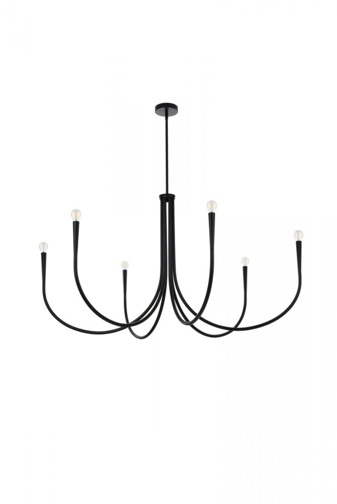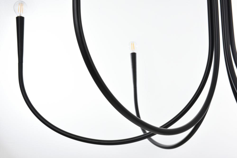 This chandelier stands out with its distinctive and eye-catching design. The smooth, soft thick metal scooped tubular arms gracefully culminate in a sleek conical shape, creating a mesmerizing visual effect that captivates anyone who lays eyes on it.