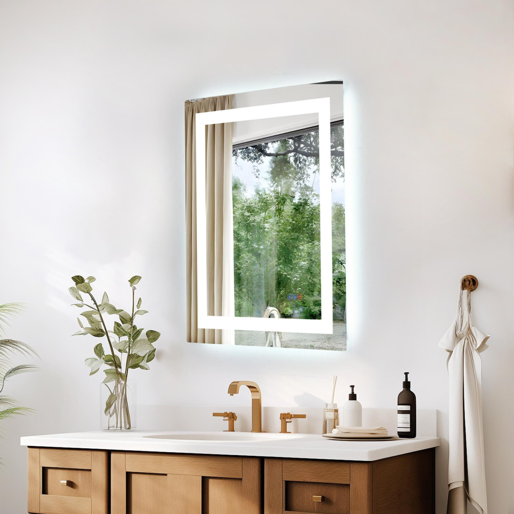 Redefine your daily routine with this ultra-modern LED mirror, designed to offer the perfect blend of style and functionality. Featuring both front and back illumination, this mirror provides a soft yet powerful glow that enhances your space with a luxurious ambiance. The adjustable color temperature (ranging from 3000K to 6400K) allows you to customize the warmth or coolness of your lighting, while the dimmable function lets you create the perfect brightness level. With a 90 CRI rating, this mirror ensures accurate color representation, making it perfect for grooming, makeup application, or daily self-care. The built-in defogger keeps your reflection clear and can be turned on or off at your convenience. Thanks to the touch sensor controls, adjusting your mirror's settings is effortless, and the memory function saves your last preferred settings for a seamless experience. Designed for versatile installation, this mirror can be hung vertically or horizontally using the included French cleats, making it a stunning and adaptable addition to any bathroom or vanity. It can be hardwired or connected to a wall switch for your convenience. Elevate your space with a mirror that not only reflects your image but also enhances your everyday routine with smart, modern lighting.
