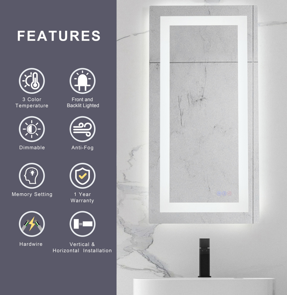 Redefine your daily routine with this ultra-modern LED mirror, designed to offer the perfect blend of style and functionality. Featuring both front and back illumination, this mirror provides a soft yet powerful glow that enhances your space with a luxurious ambiance. The adjustable color temperature (ranging from 3000K to 6400K) allows you to customize the warmth or coolness of your lighting, while the dimmable function lets you create the perfect brightness level. With a 90 CRI rating, this mirror ensures accurate color representation, making it perfect for grooming, makeup application, or daily self-care. The built-in defogger keeps your reflection clear and can be turned on or off at your convenience. Thanks to the touch sensor controls, adjusting your mirror's settings is effortless, and the memory function saves your last preferred settings for a seamless experience. Designed for versatile installation, this mirror can be hung vertically or horizontally using the included French cleats, making it a stunning and adaptable addition to any bathroom or vanity. It can be hardwired or connected to a wall switch for your convenience. Elevate your space with a mirror that not only reflects your image but also enhances your everyday routine with smart, modern lighting.