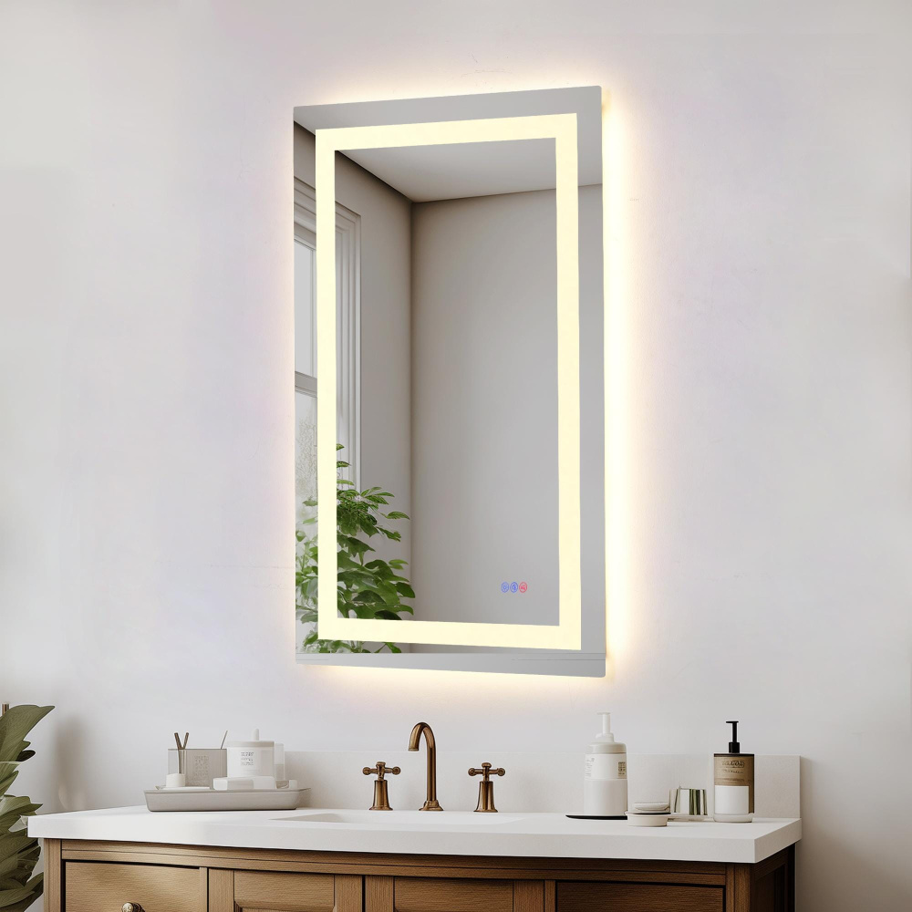 Redefine your daily routine with this ultra-modern LED mirror, designed to offer the perfect blend of style and functionality. Featuring both front and back illumination, this mirror provides a soft yet powerful glow that enhances your space with a luxurious ambiance. The adjustable color temperature (ranging from 3000K to 6400K) allows you to customize the warmth or coolness of your lighting, while the dimmable function lets you create the perfect brightness level. With a 90 CRI rating, this mirror ensures accurate color representation, making it perfect for grooming, makeup application, or daily self-care. The built-in defogger keeps your reflection clear and can be turned on or off at your convenience. Thanks to the touch sensor controls, adjusting your mirror's settings is effortless, and the memory function saves your last preferred settings for a seamless experience. Designed for versatile installation, this mirror can be hung vertically or horizontally using the included French cleats, making it a stunning and adaptable addition to any bathroom or vanity. It can be hardwired or connected to a wall switch for your convenience. Elevate your space with a mirror that not only reflects your image but also enhances your everyday routine with smart, modern lighting.