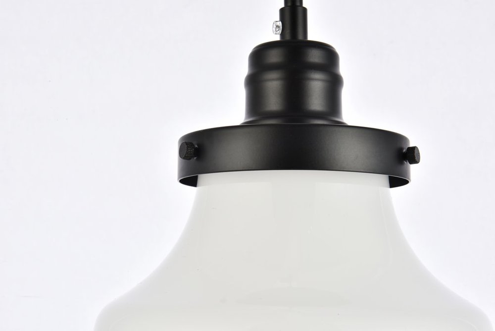 Pendant lamp features a black and frosted white glass.