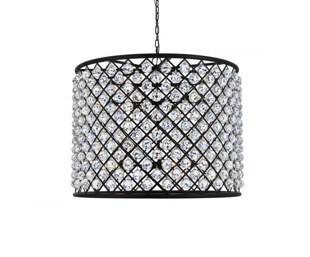 Lamp features a diameter of 35.5 inches, a height of 28 inches, a minimum hanging length of 34 inches, a maximum hanging length of 88 inches, and requires 12 candelabra bulbs