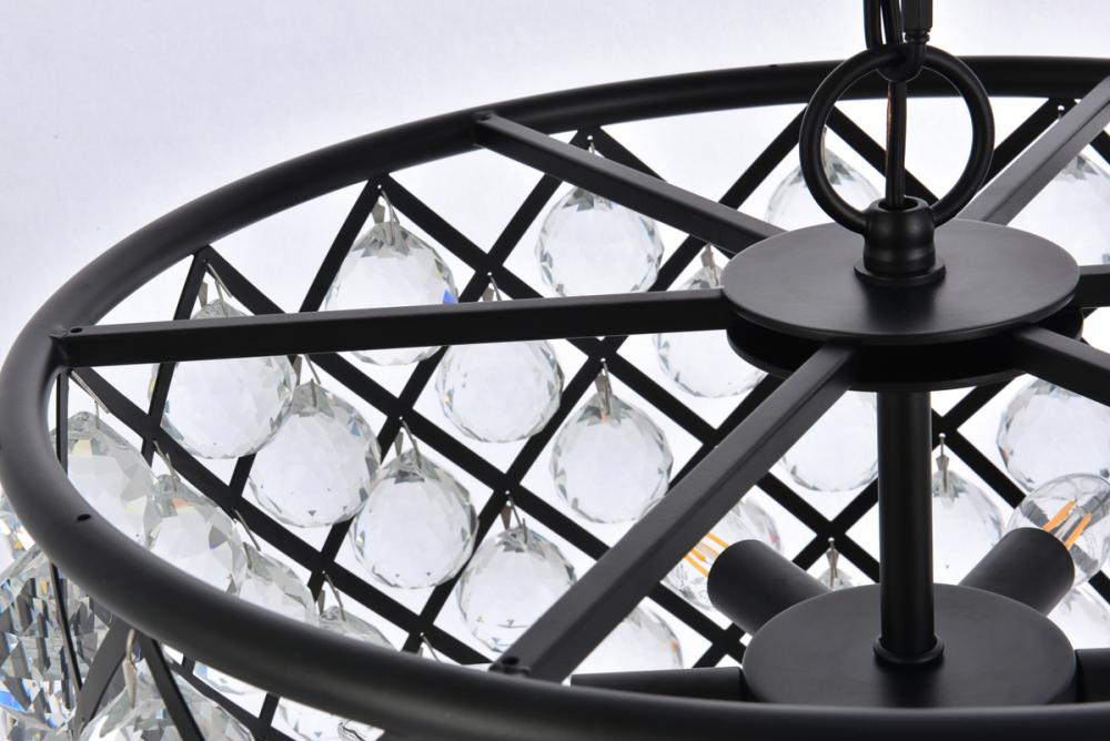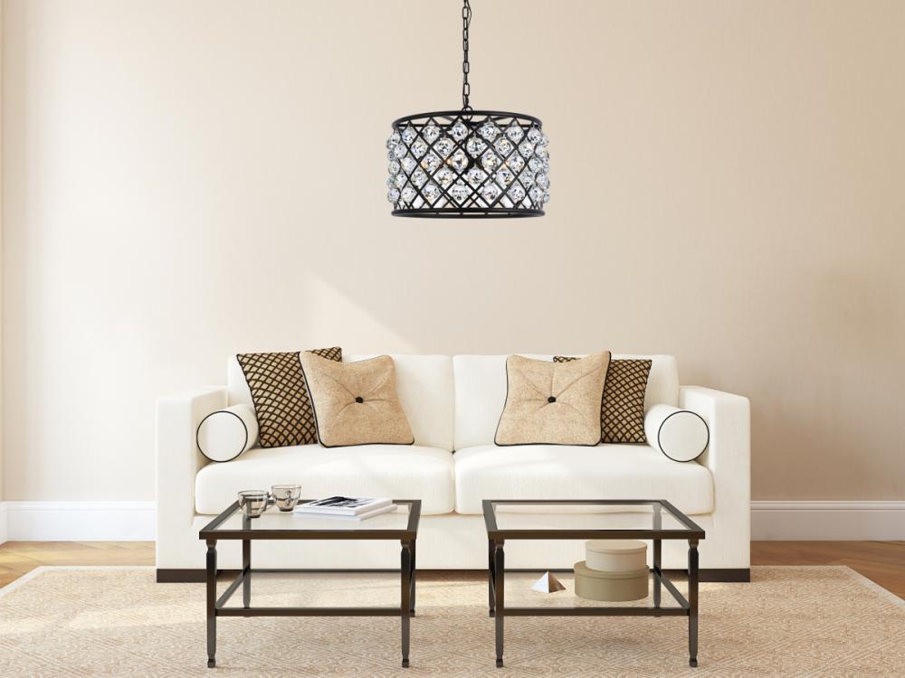 Lamp features a diameter of 20 inches, a height of 13 inches, a minimum hanging length of 19 inches, a maximum hanging length of 73 inches, and requires 6 candelabra bulbs