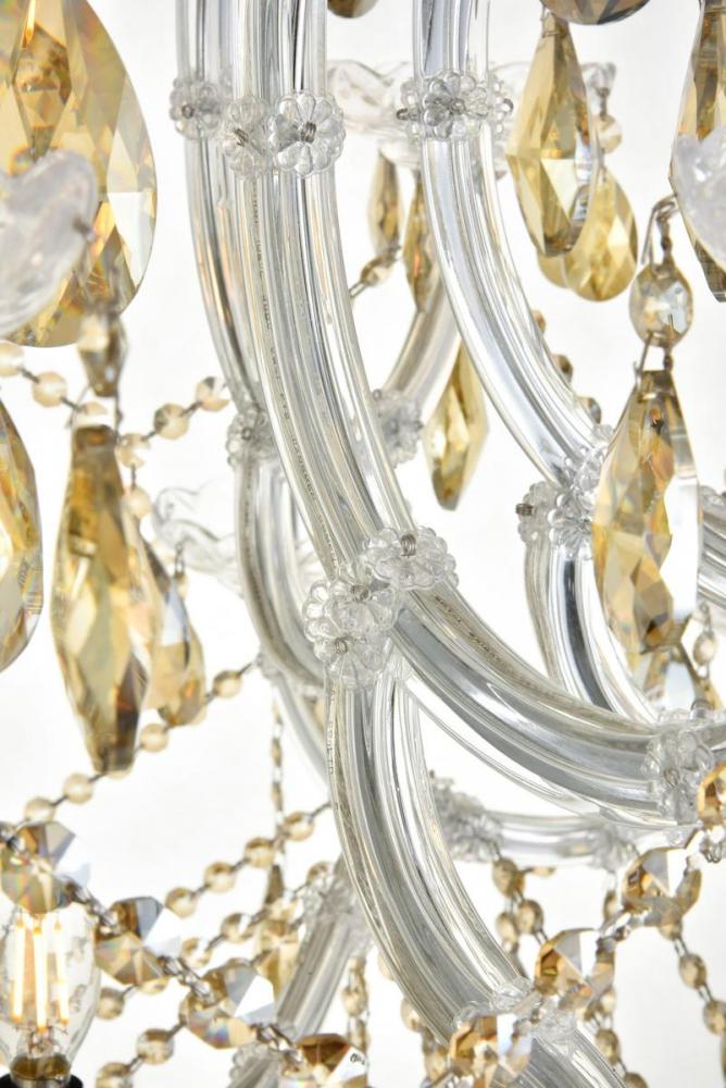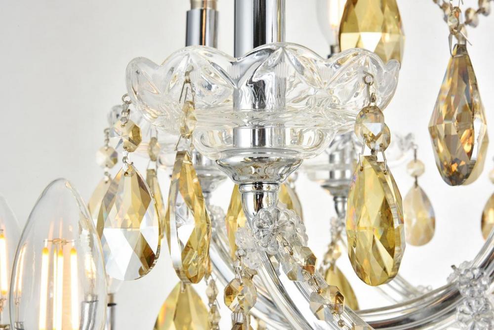 A heavenly high point to your home, Maria Theresa chandeliers are ablaze with hundreds of resplendent crystals. Copious strands of sparkling golden teak crystals dangle from elaborate tiers of glass-coated steel arms in chrome finish. An imperial favorite for the stairwell, dining room, or living room.