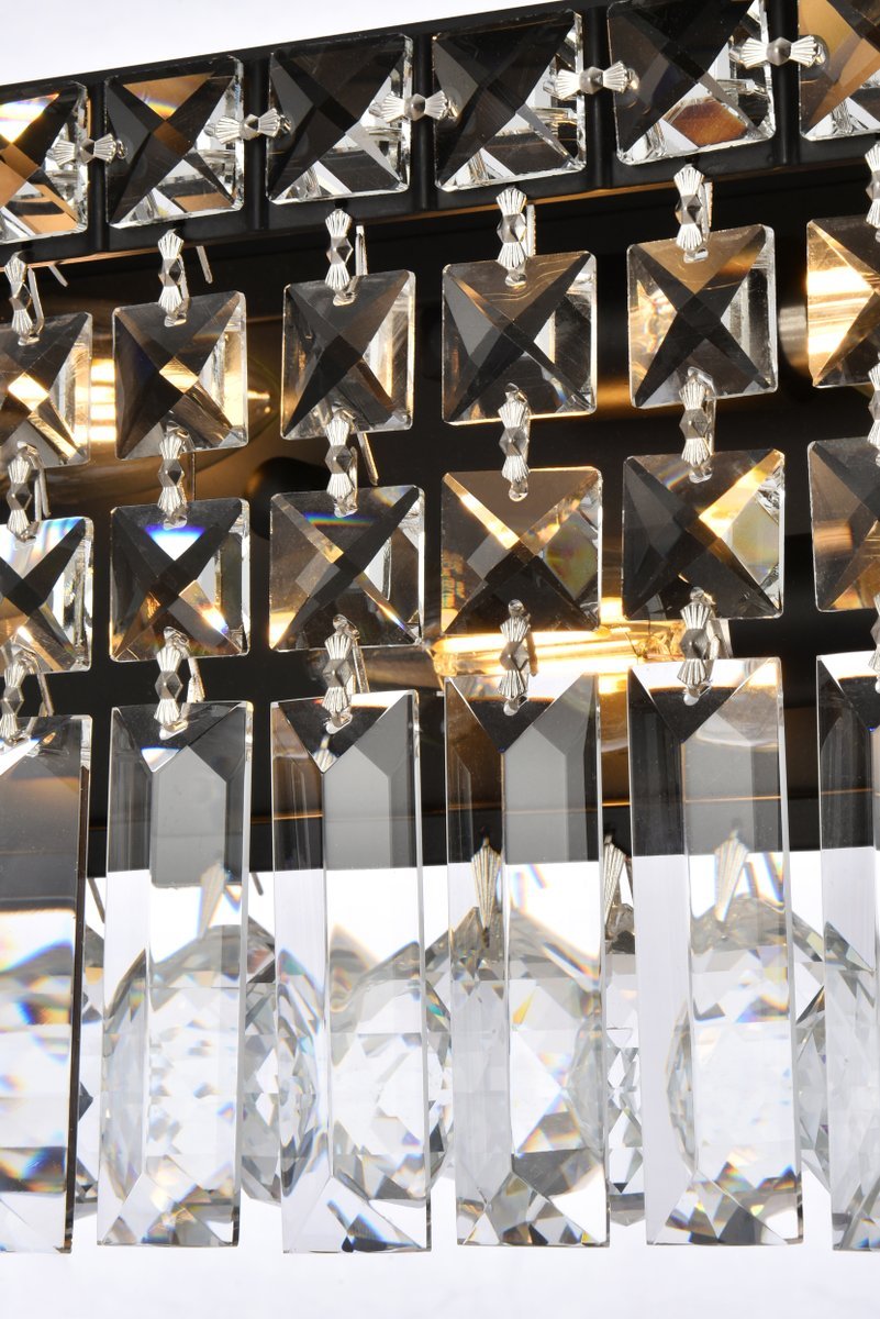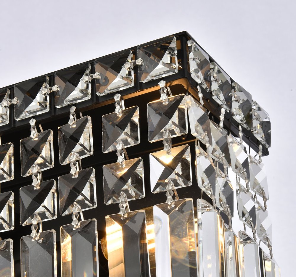 A riot of shapes and textures, Maxime collection wall sconces sparkle in a mosaic of crystal tiles. Square and rectangular precision-cut crystals form the flamboyant semicylindrical or rectangular exterior while faceted crystal balls create a bubbled effect for light to shine through beneath. Available in a black or chrome finish with clear crystals, these lamps are a luxurious addition to a bathroom, entryway, or kitchen.