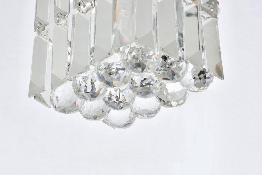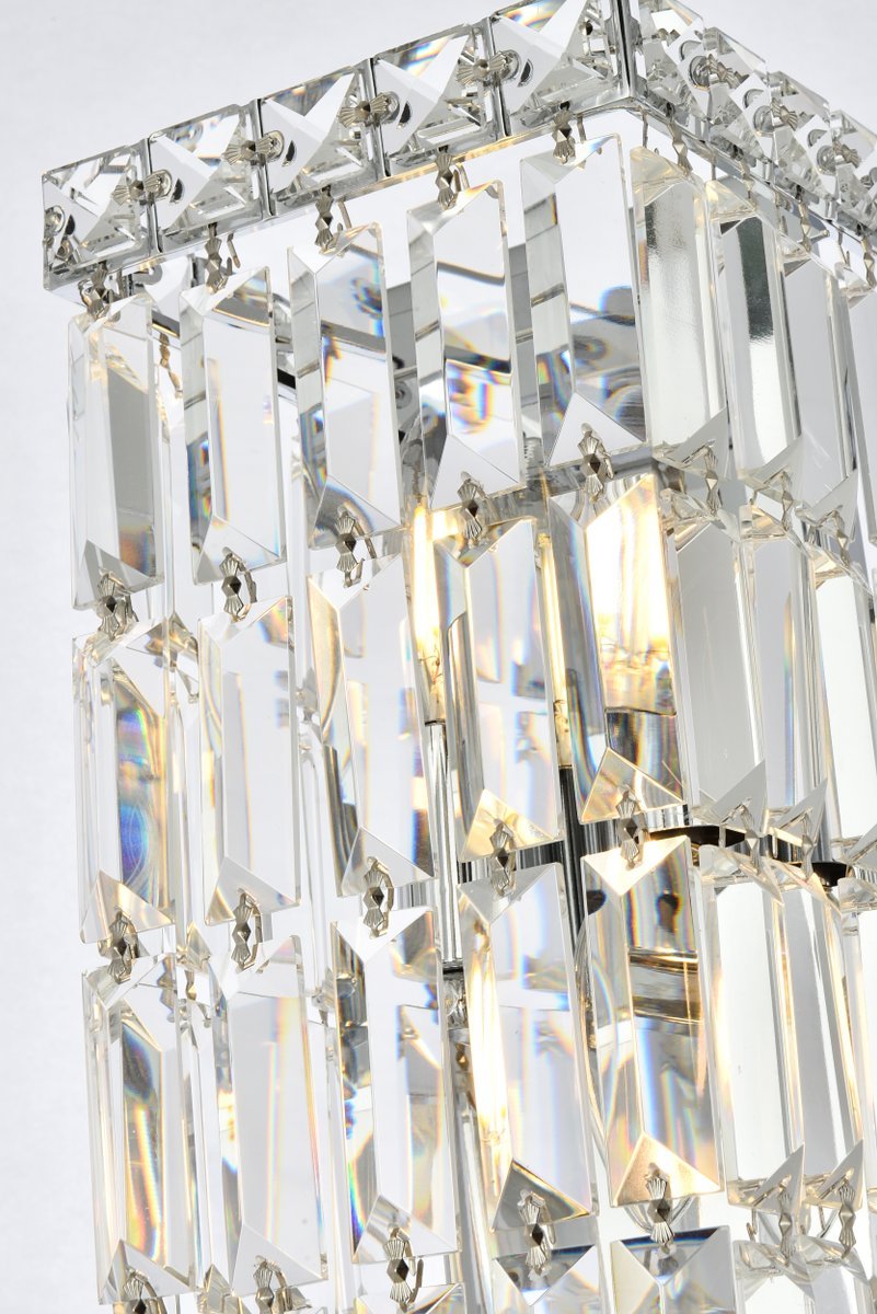 A riot of shapes and textures, Maxime collection wall sconces sparkle in a mosaic of crystal tiles. Square and rectangular precision-cut crystals form the flamboyant semicylindrical or rectangular exterior while faceted crystal balls create a bubbled effect for light to shine through beneath. Available in a chrome finish with clear or golden-teak crystals, these lamps are a luxurious addition to a bathroom, entryway, or kitchen.