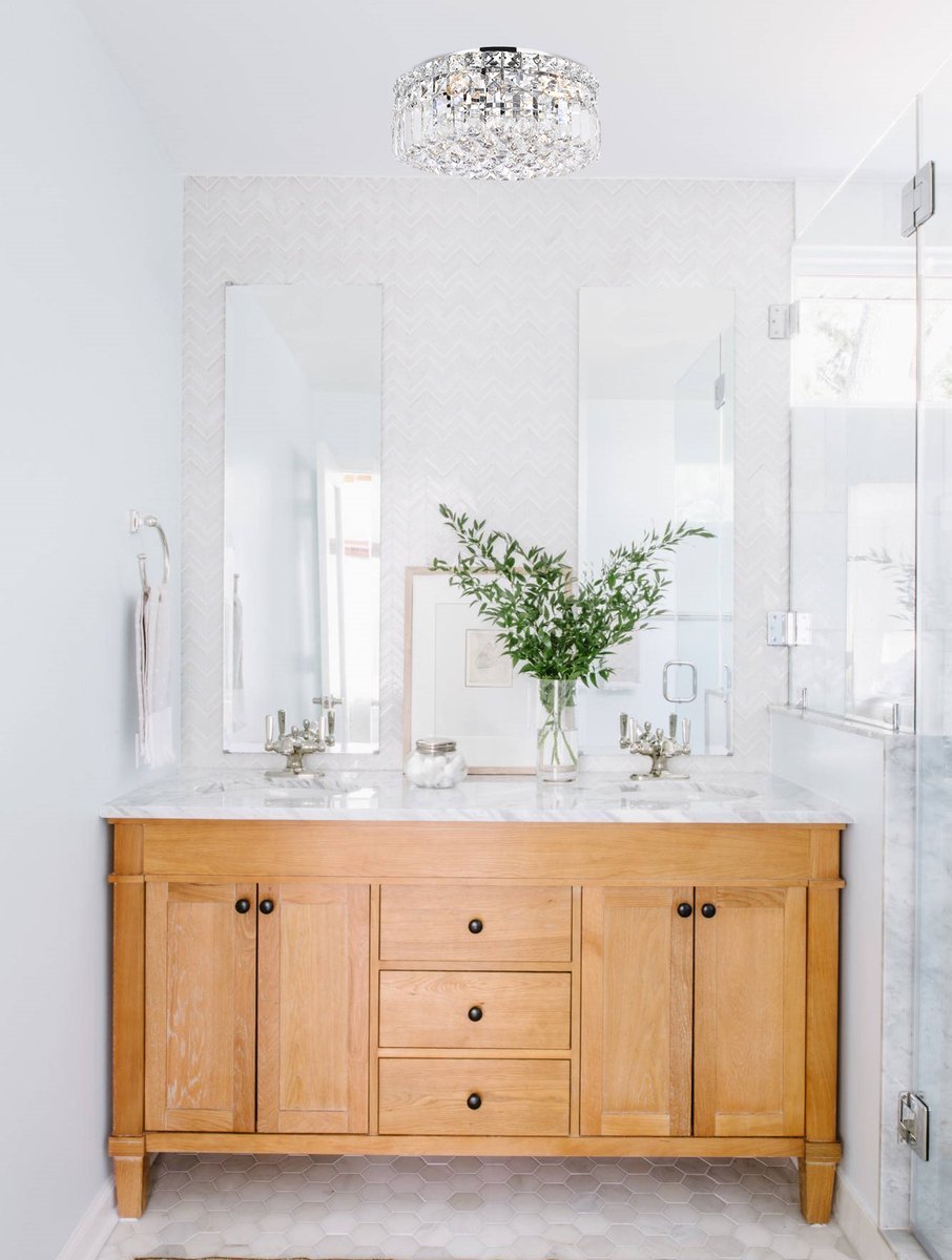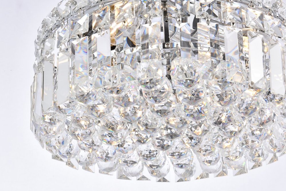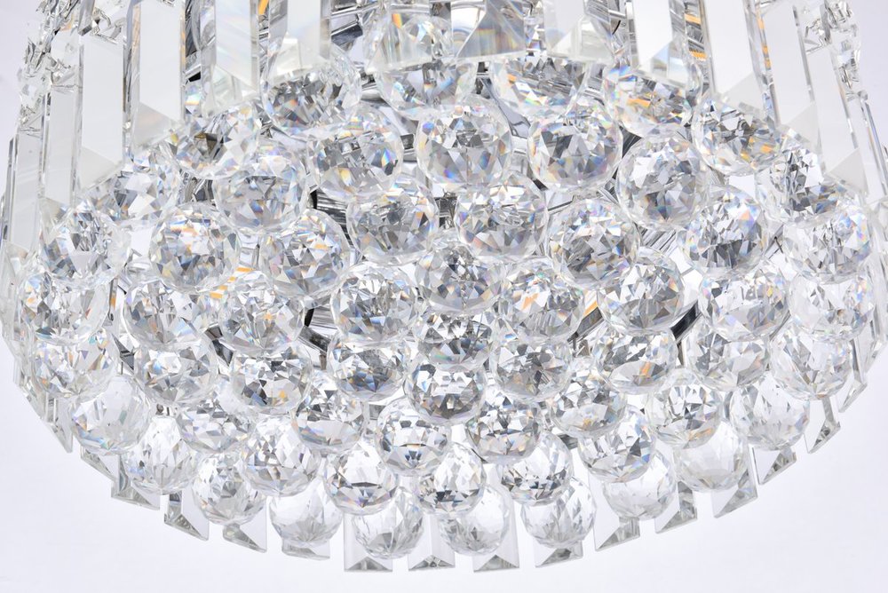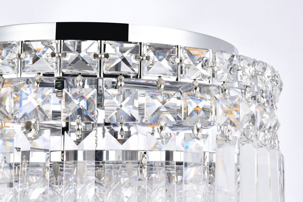 A riot of shapes and textures, Maxime collection flush mounts sparkle in a mosaic of crystal tiles. Square and rectangular precision-cut crystals form the flamboyant exterior while faceted crystal balls create a bubbled effect for light to shine through beneath. Available in a chrome finish with clear crystals, these lamps are a luxurious addition to a kitchen, stairwell, foyer, or living room.
