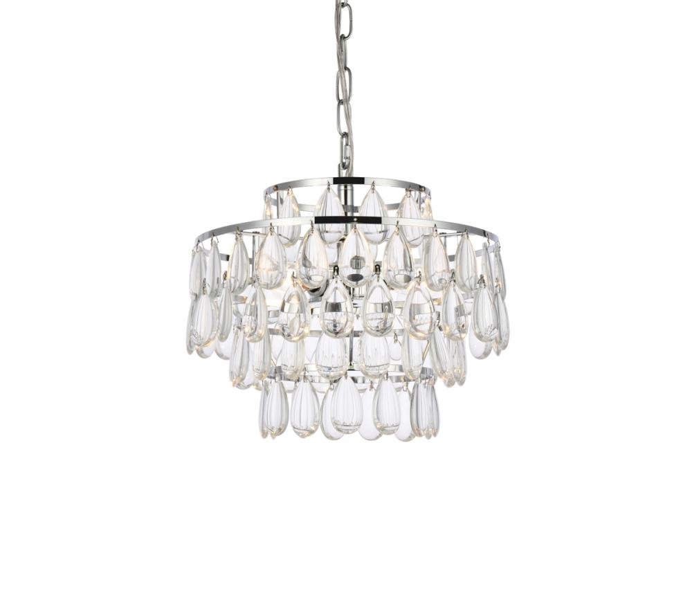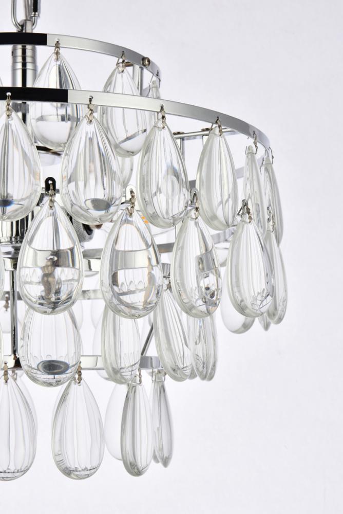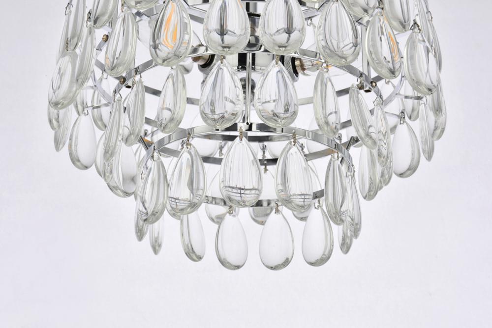 Tiers of clear smooth almond shaped crystals reflect the soft glow of candelabra bulbs