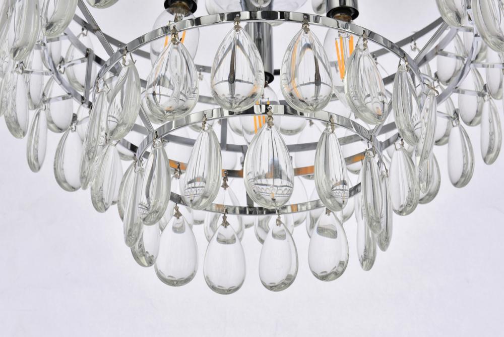 Tiers of clear smooth almond shaped crystals reflect the soft glow of candelabra bulbs