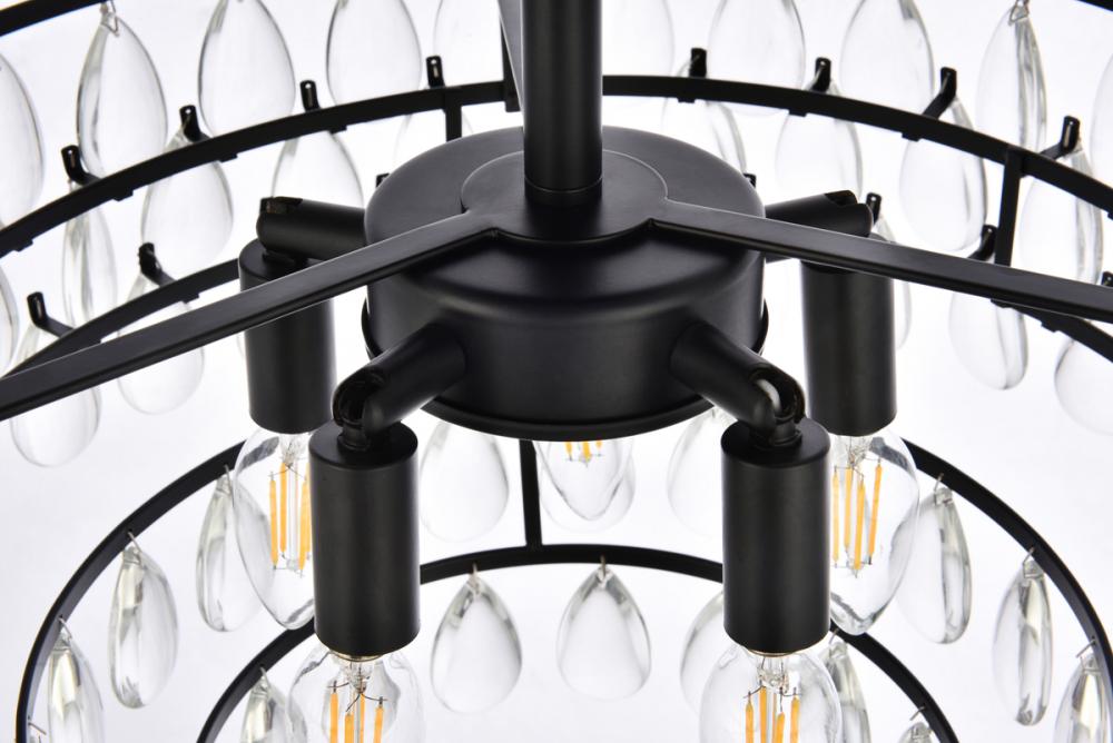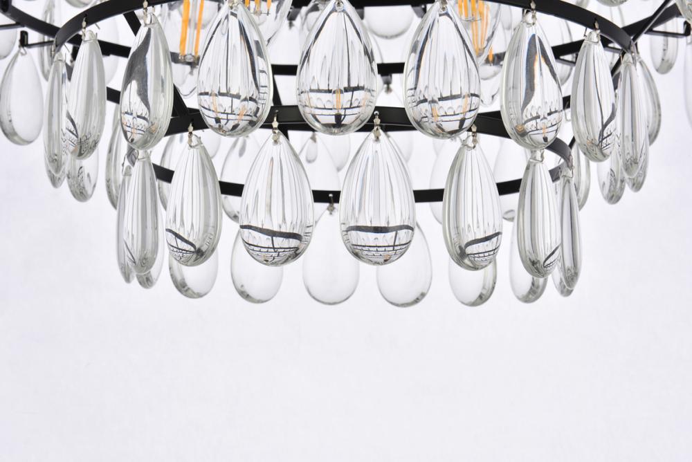 Tiers of clear smooth almond shaped crystals reflect the soft glow of candelabra bulbs