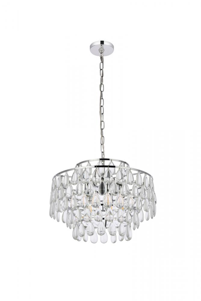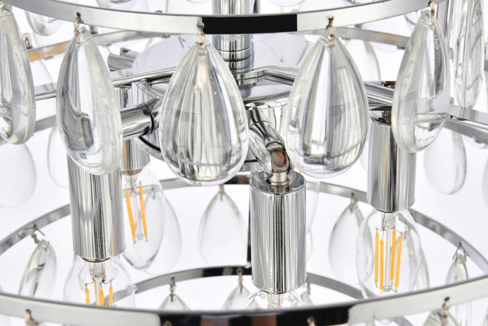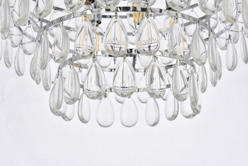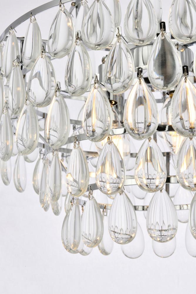 Tiers of clear smooth almond shaped crystals reflect the soft glow of candelabra bulbs