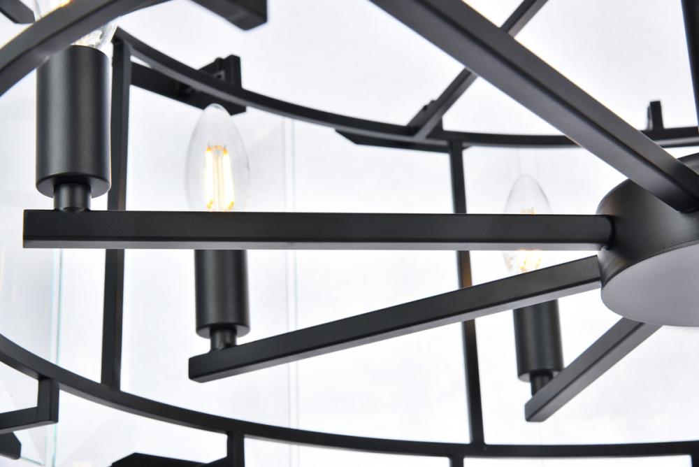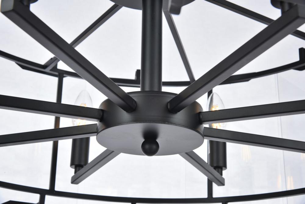 Lamp features a diameter of 30 inches, a height of 12 inches, a minimum hanging length of 18 inches, a maximum hanging length of 72 inches, and requires 8 candelabra bulbs