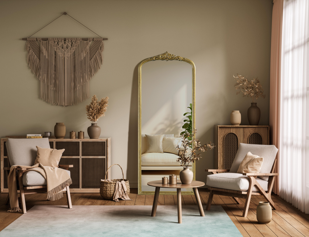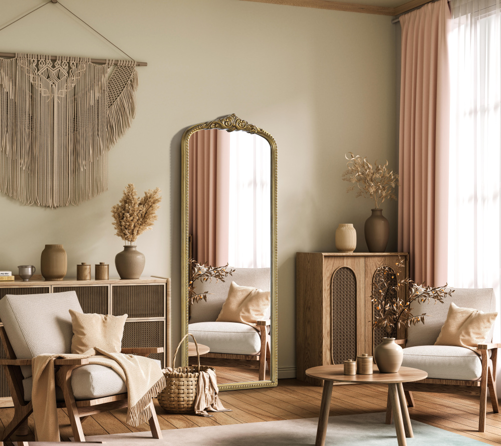 The tall, arched silhouette creates a striking focal point, perfect for full-body reflections and enhancing room depth.
