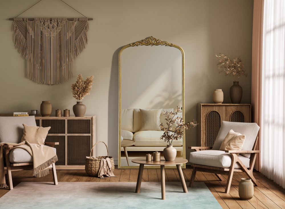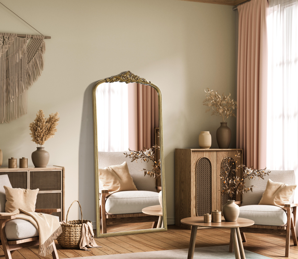 The tall, arched silhouette creates a striking focal point, perfect for full-body reflections and enhancing room depth.