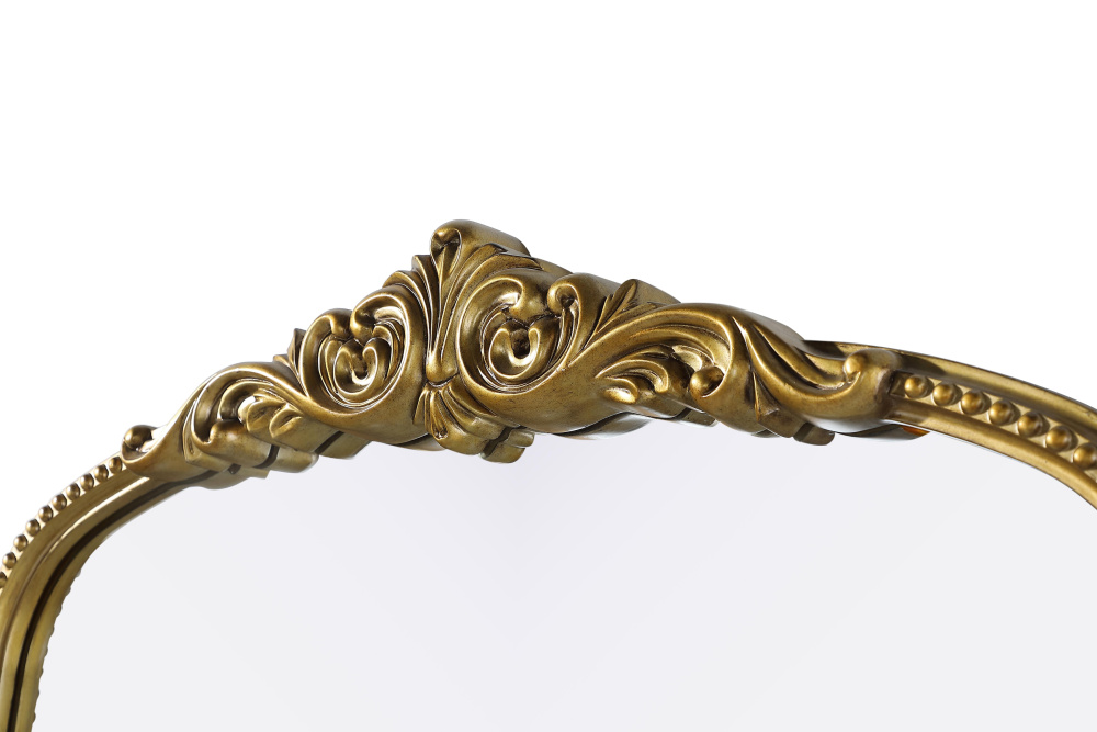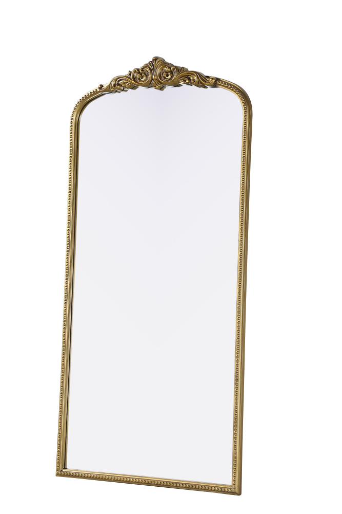 This full-length arched mirror brings a timeless, vintage-inspired charm to any space. The hand-painted antique brass finish and ornate crest detailing create a classic European look, perfect for traditional and French-inspired interiors. Whether leaned against the wall for a relaxed aesthetic or securely mounted using the metal inset hanger, this mirror offers versatility and refined style. Constructed from lightweight yet durable resin with an MDF backing board, it ensures long-lasting support and stability. Available in multiple sizes, this mirror is an ideal choice for bedrooms, entryways, and dressing areas, adding depth, light, and an elegant architectural presence to any room.